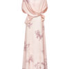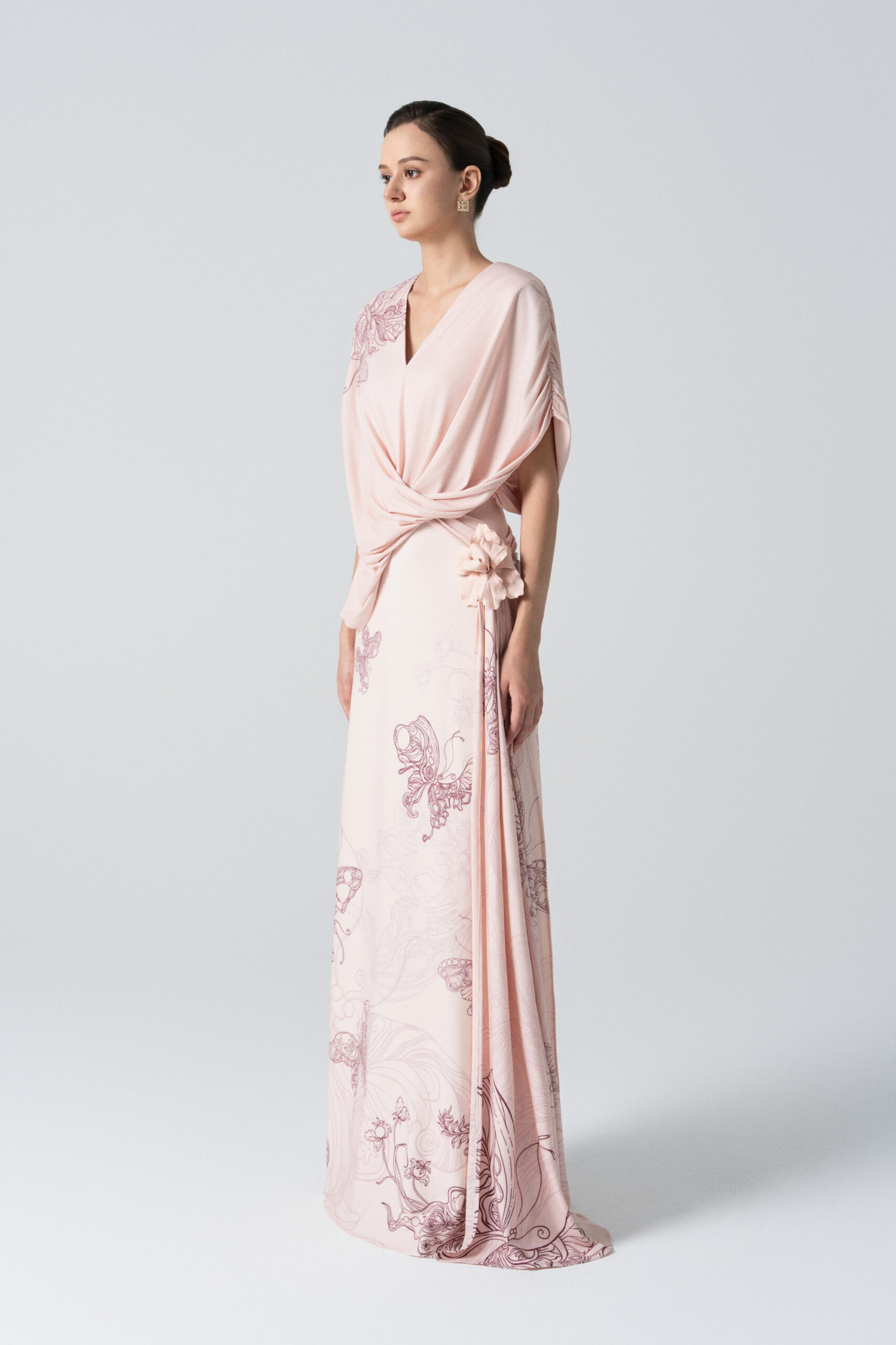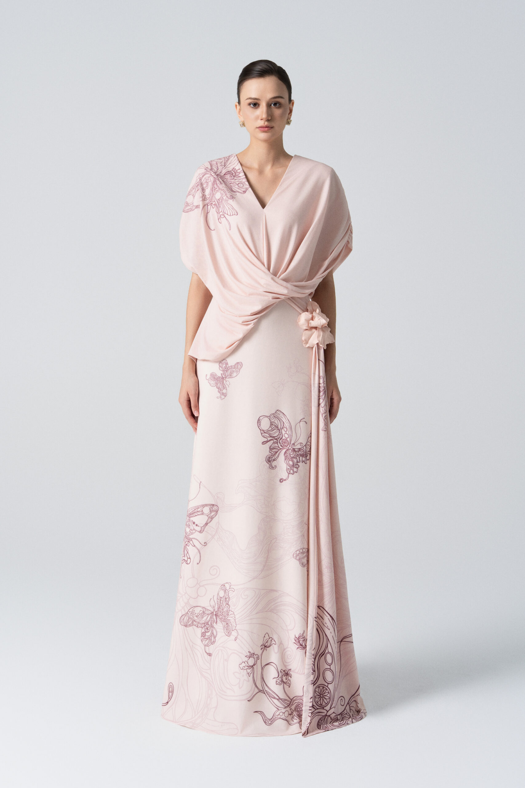 A midi mermaid dress with a V-neckline, softly draped bodice and asymmetrical pleating at the waist with long scarf.