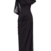 An asymmetric midi dress with a draped bodice that crosses from shoulder to chest. The corset-style waist creates a focal point, while the hip features soft draping that flows gently down to the hem.