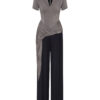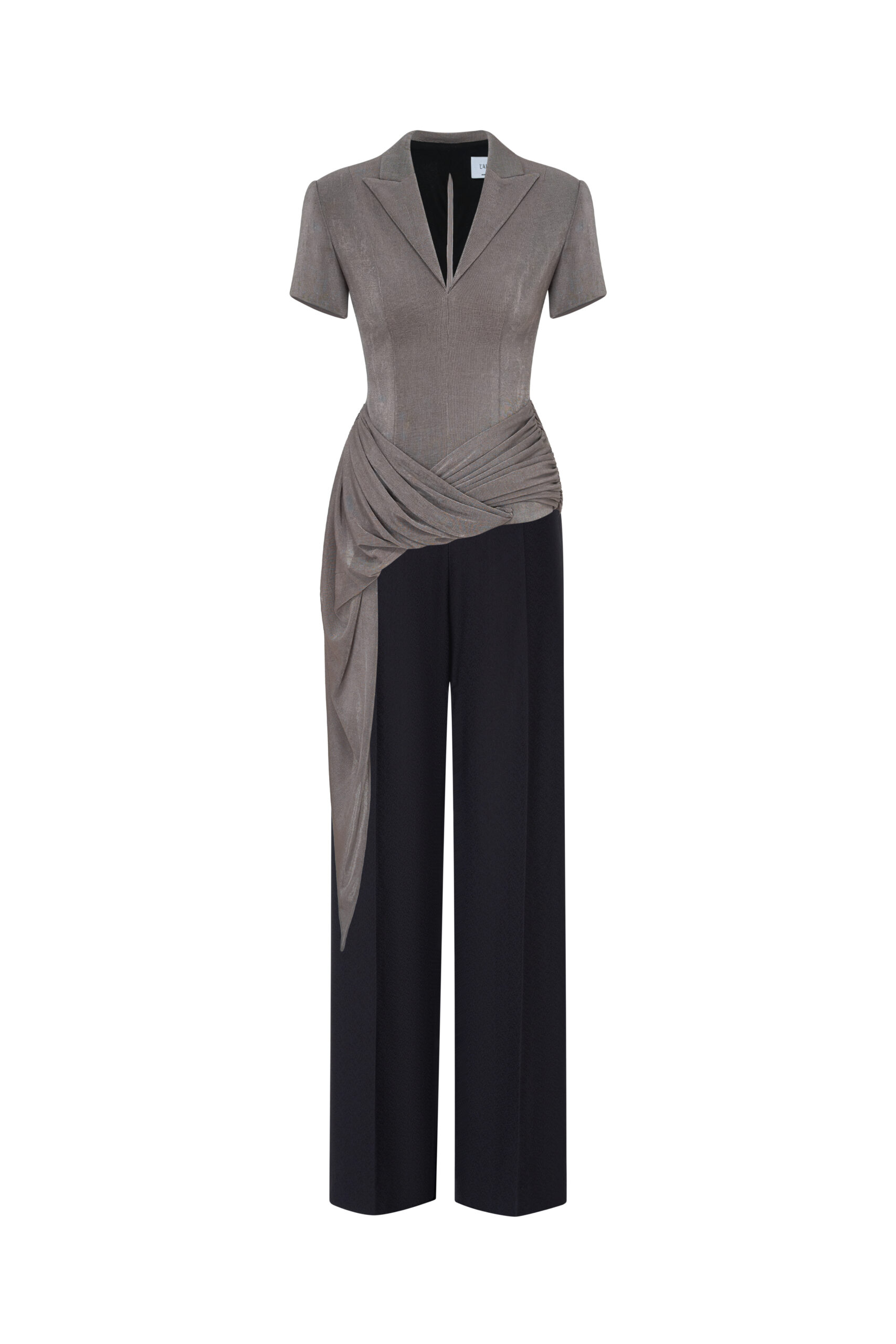 A classic V-neck blazer with long sleeves, featuring asymmetric waist draping that adds sculptural depth. Wide-leg straight trousers with two clean pleats.