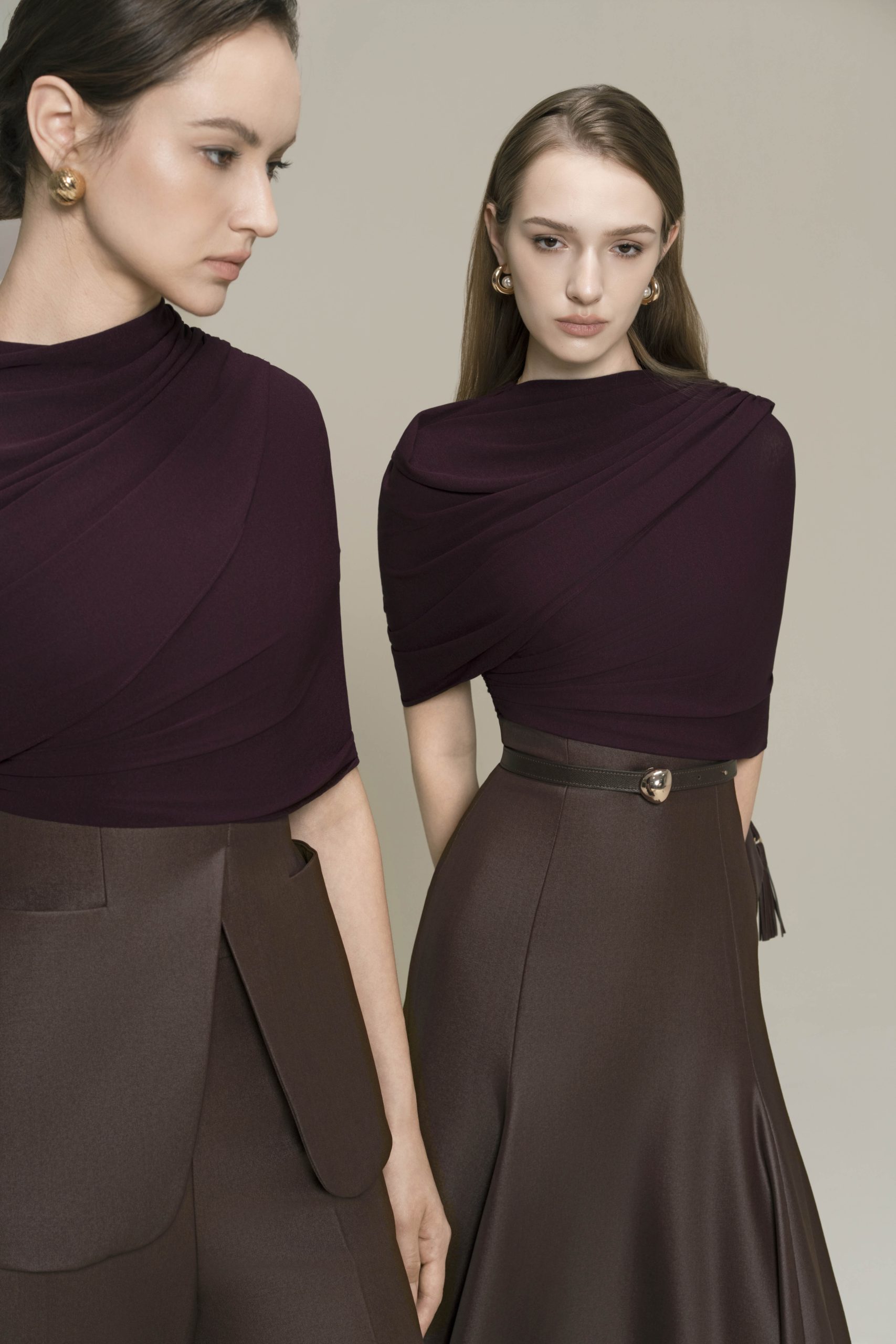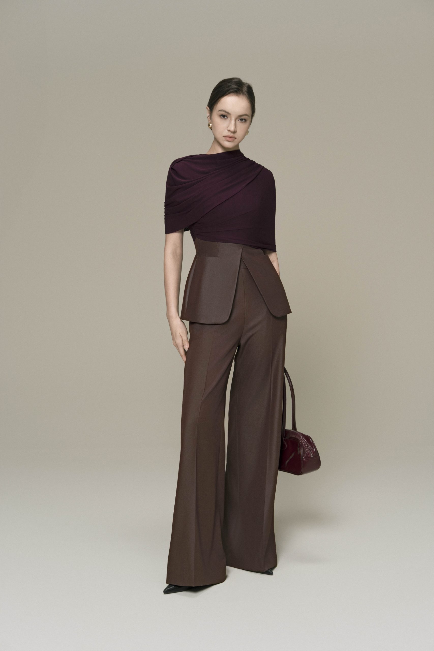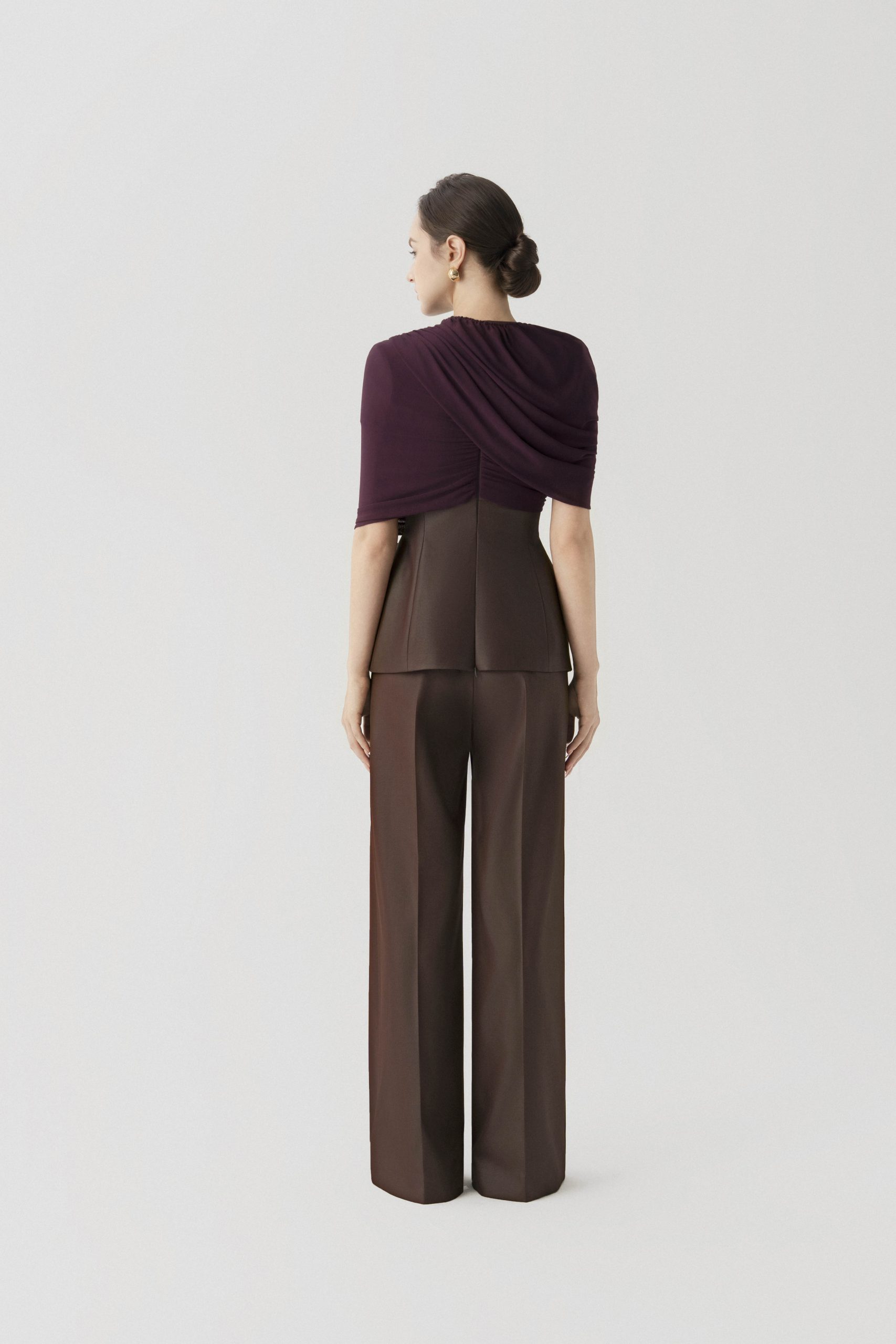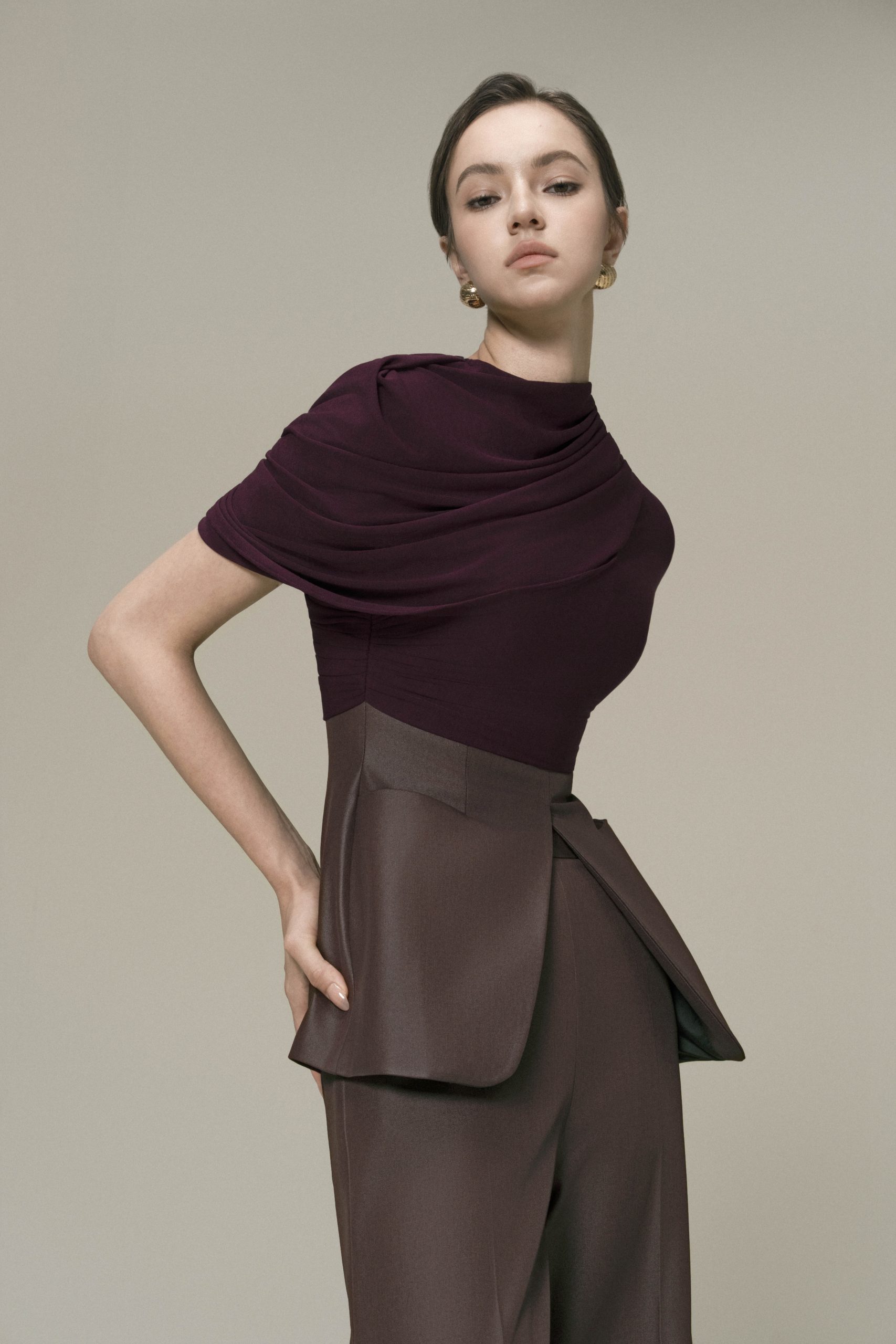 A fitted blazer with a cinched waist, featuring a draped, cross-body detail over the shoulder and a slender belt