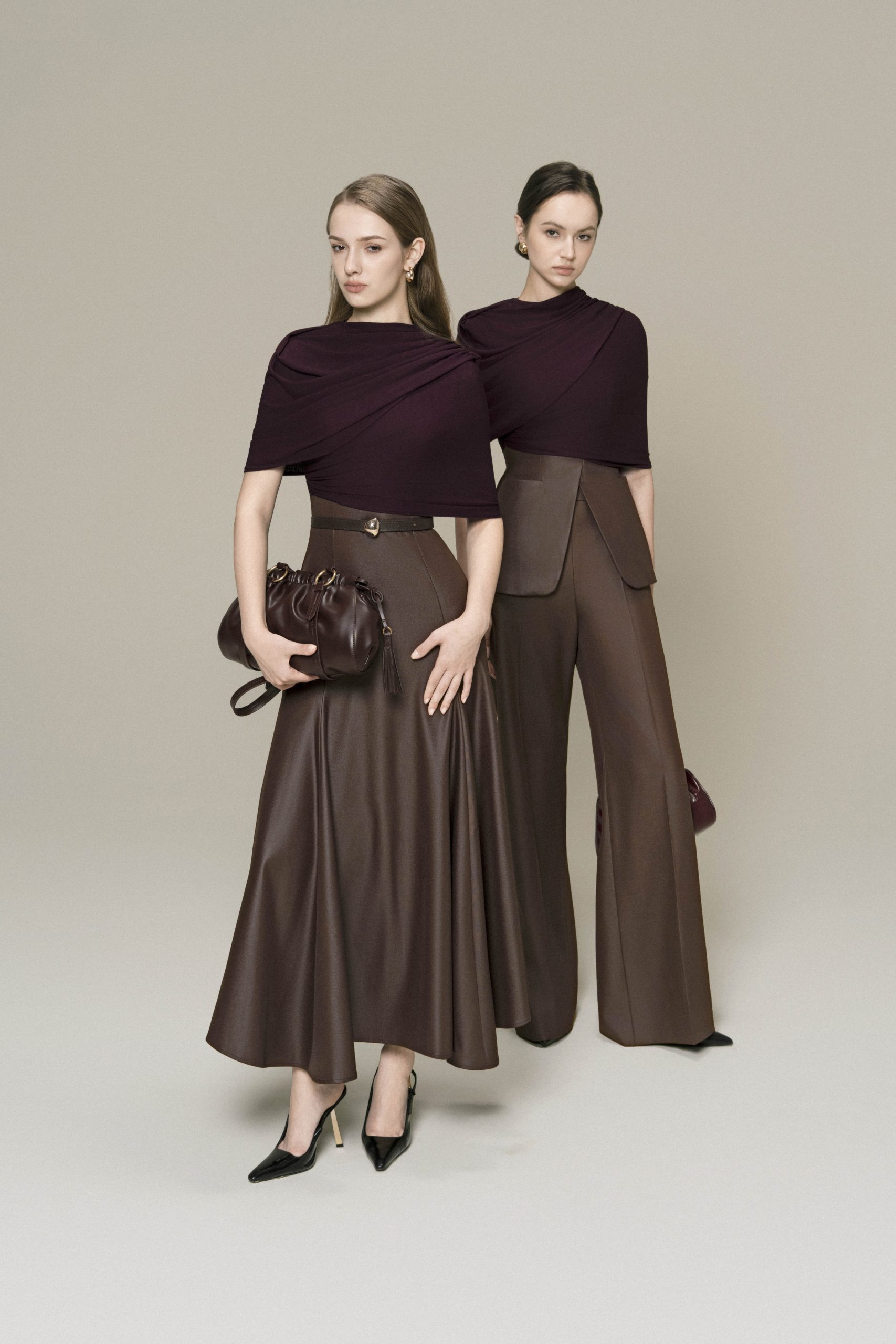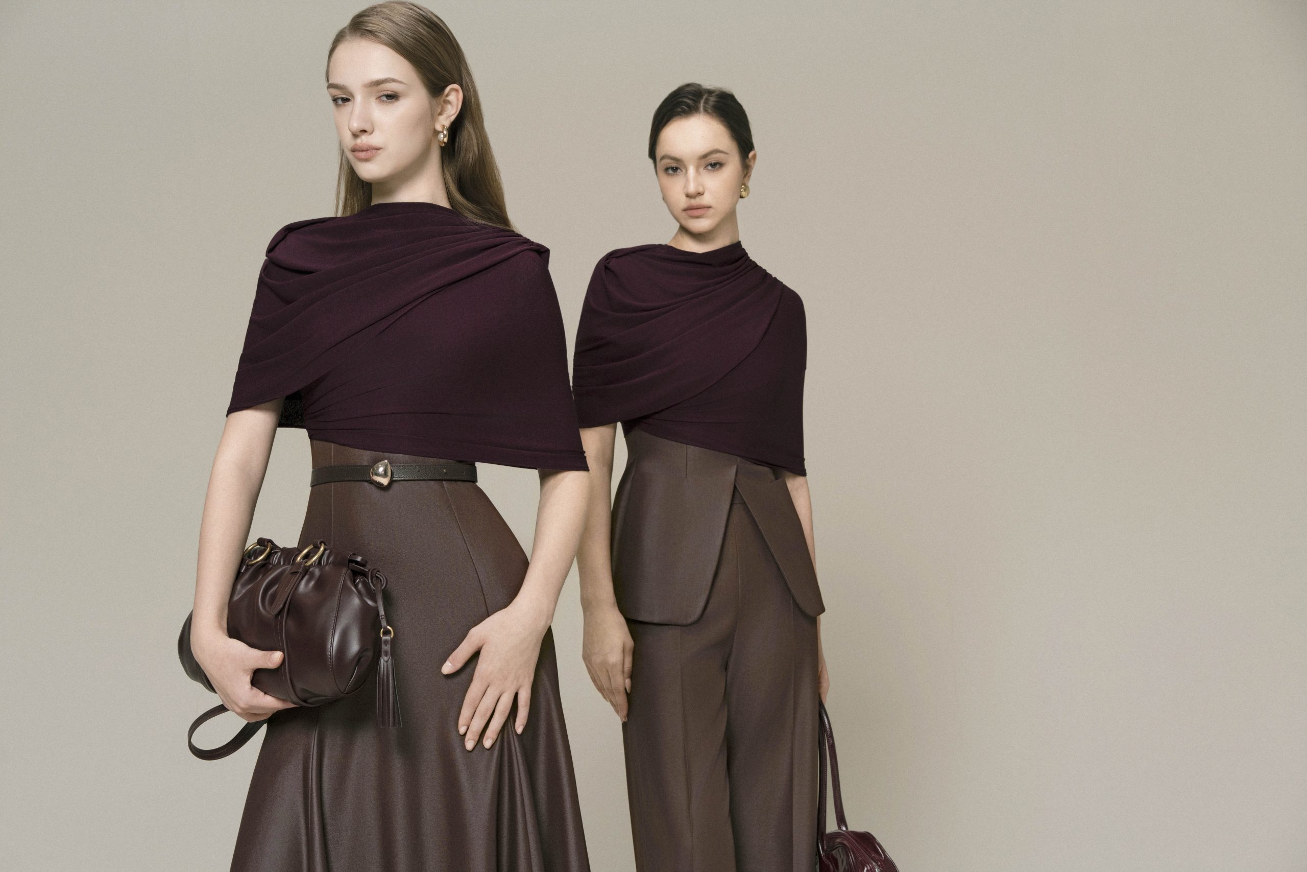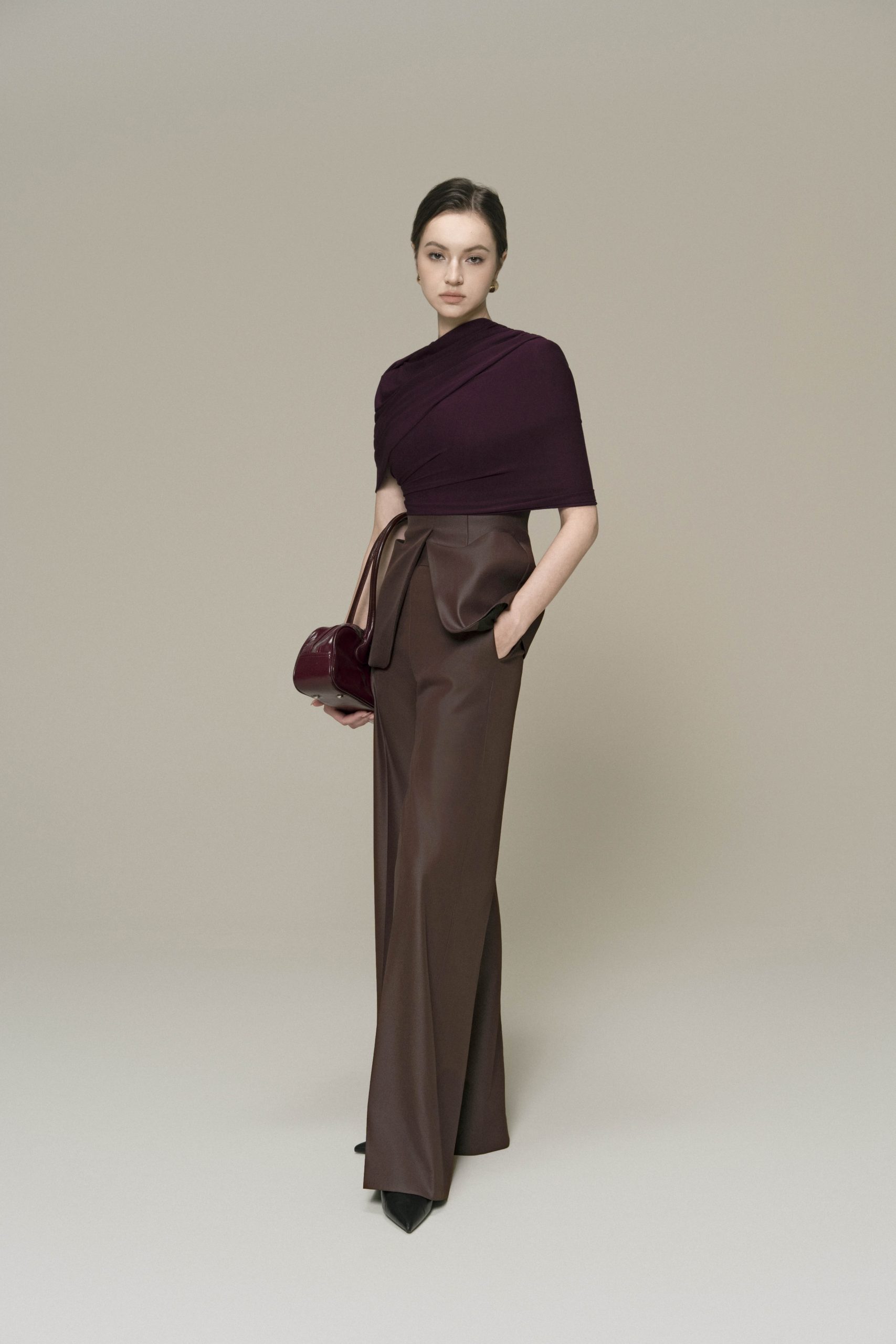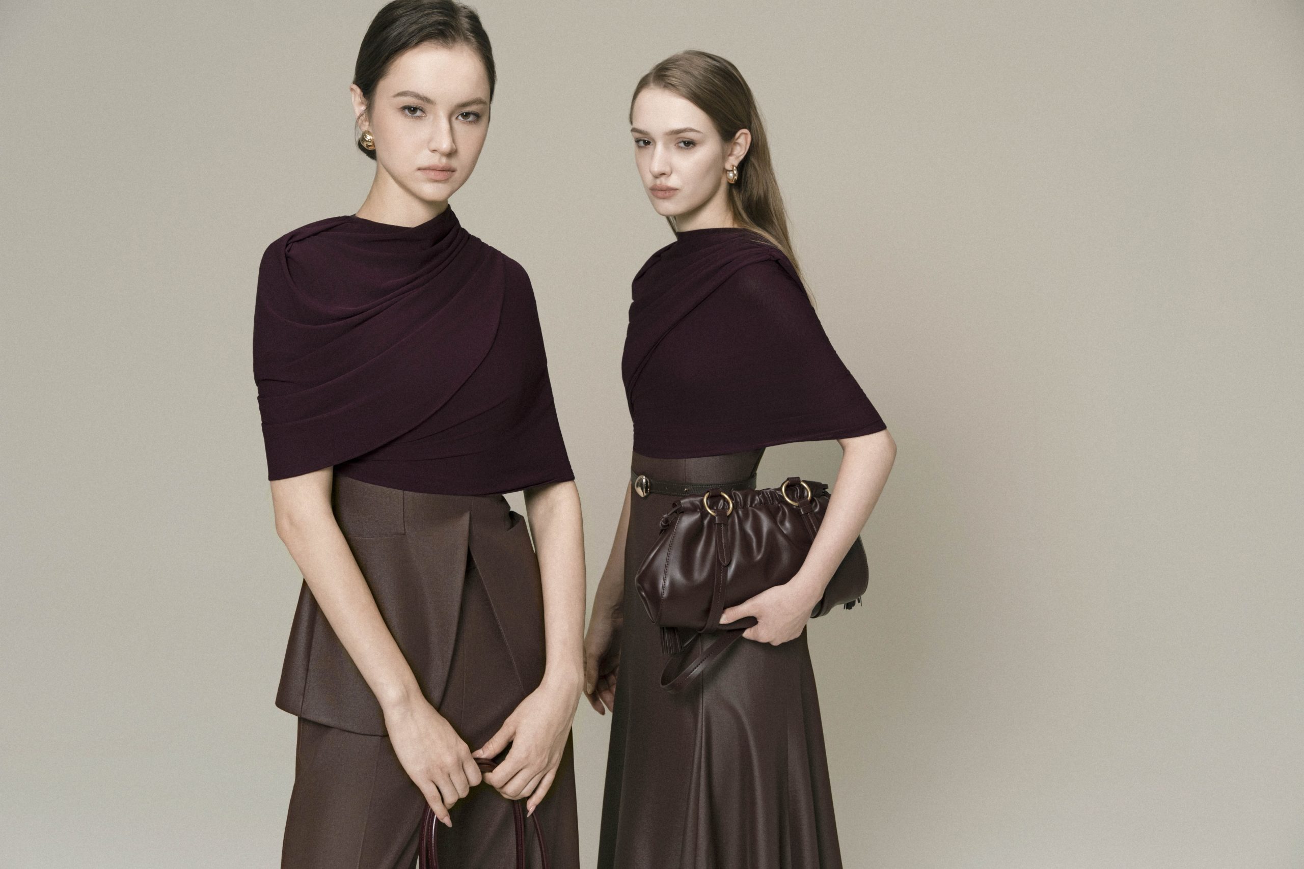 A fitted blazer with a cinched waist, featuring a draped, cross-body detail over the shoulder and a slender belt