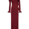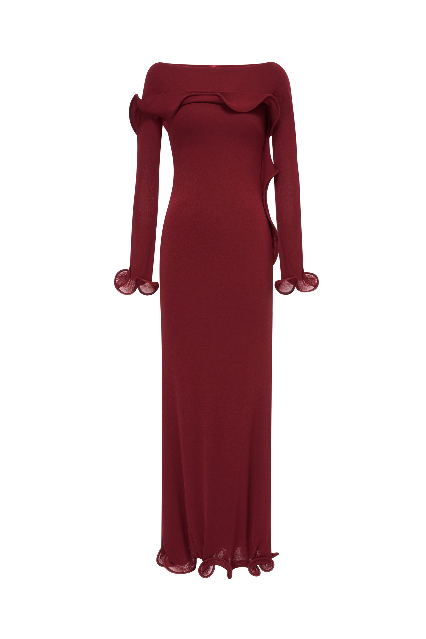 A fitted mermaid maxi dress with an off-shoulder neckline, featuring a cascading ruffle detail flowing from the shoulders across the chest down to the waist. The elbow-length sleeves are fitted, and both the sleeve hems and skirt hem are structured with boning to create soft, undulating ruffles.