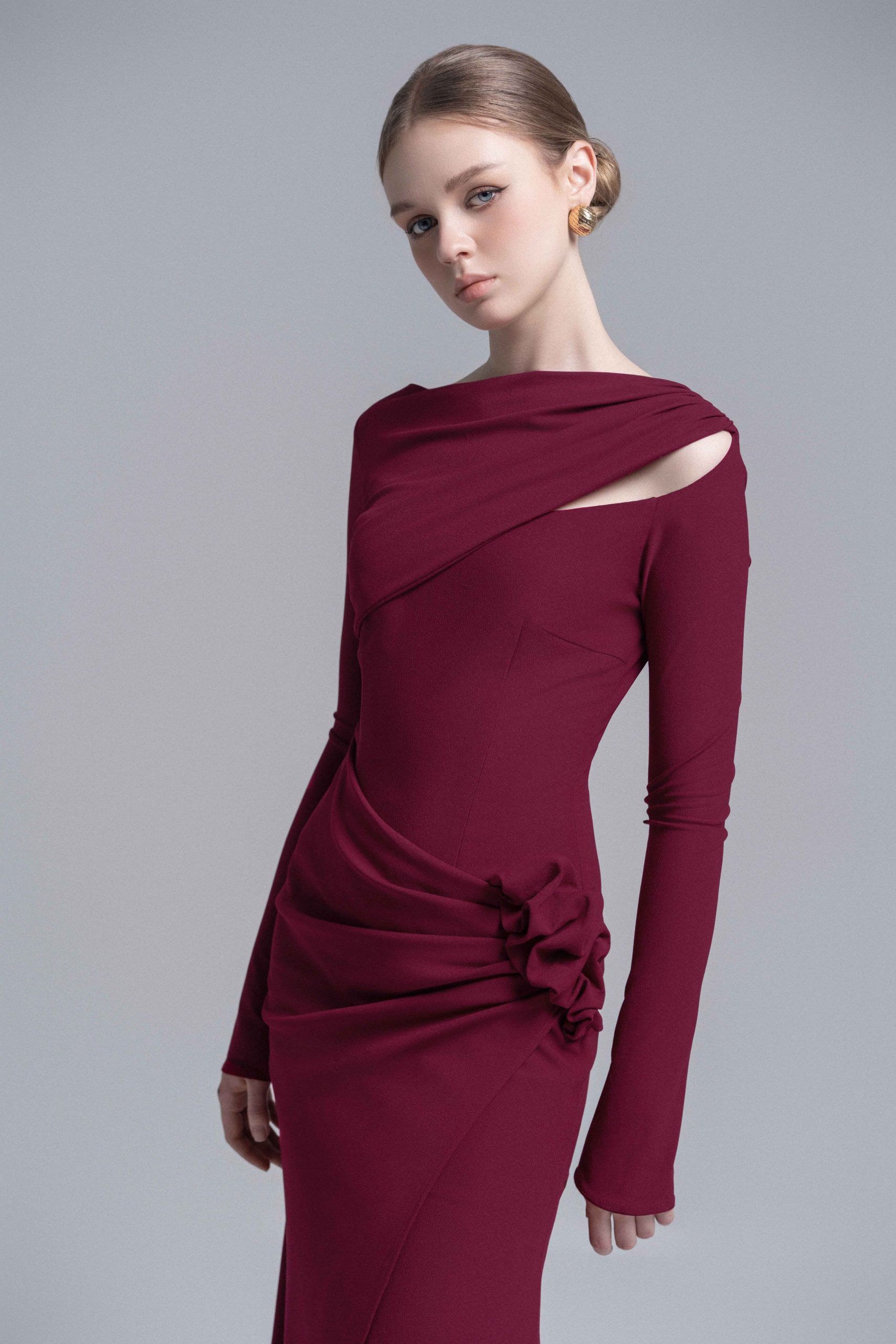 A captivating take on asymmetry, this midi dress features a soft, draped layer that wraps over one shoulder, combined with a sculpted twist and subtle cut-out detail. A fitted waist with precise gathers contrasts beautifully with the fluid, elongated lower half, which integrates the sleeve into the skirt panel for an avant-garde finish.