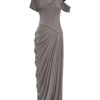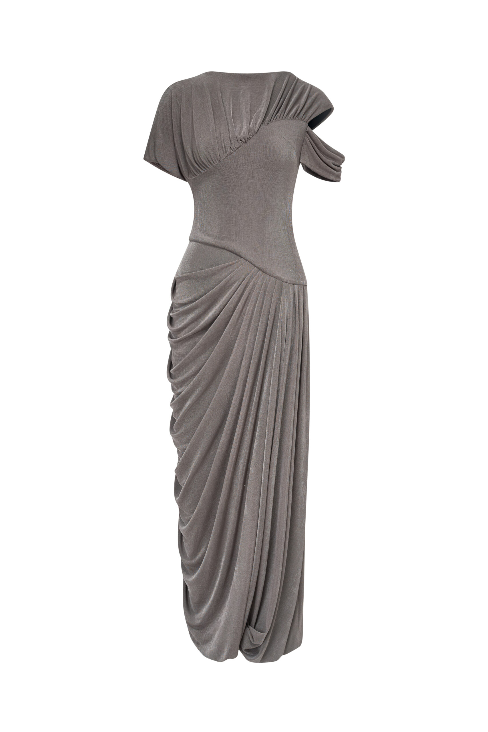 A midi dress with a softly draped bodice and asymmetric off-shoulder sleeves, featuring a fitted corset waist and a skirt with gentle draped folds.