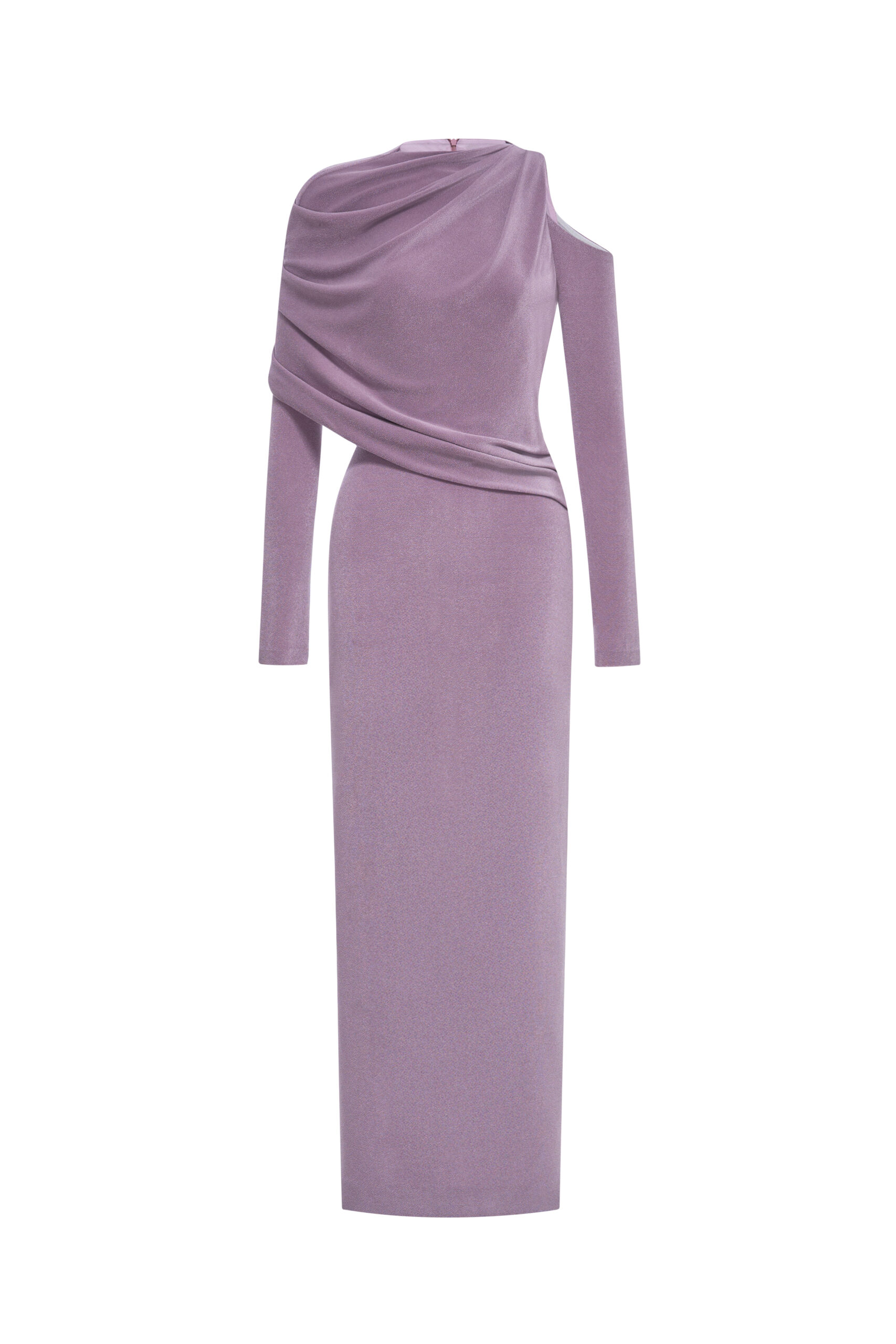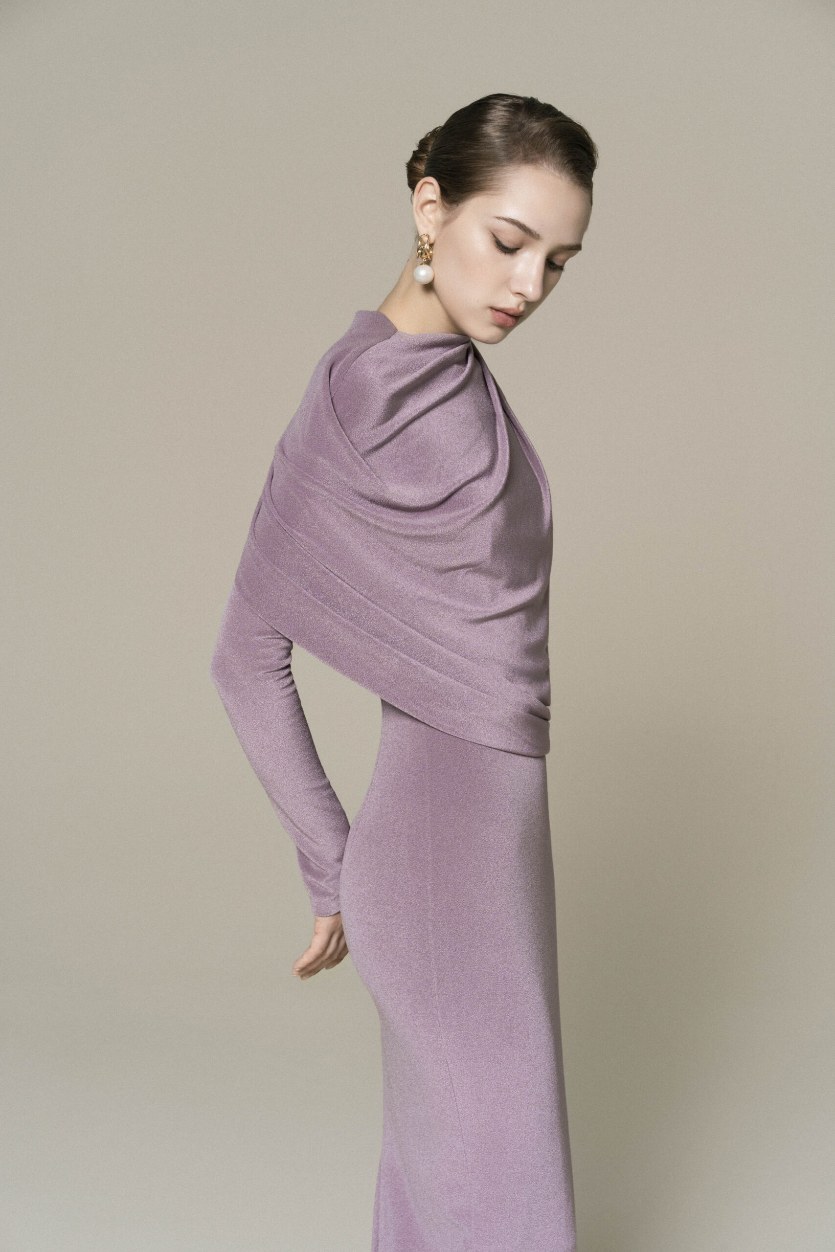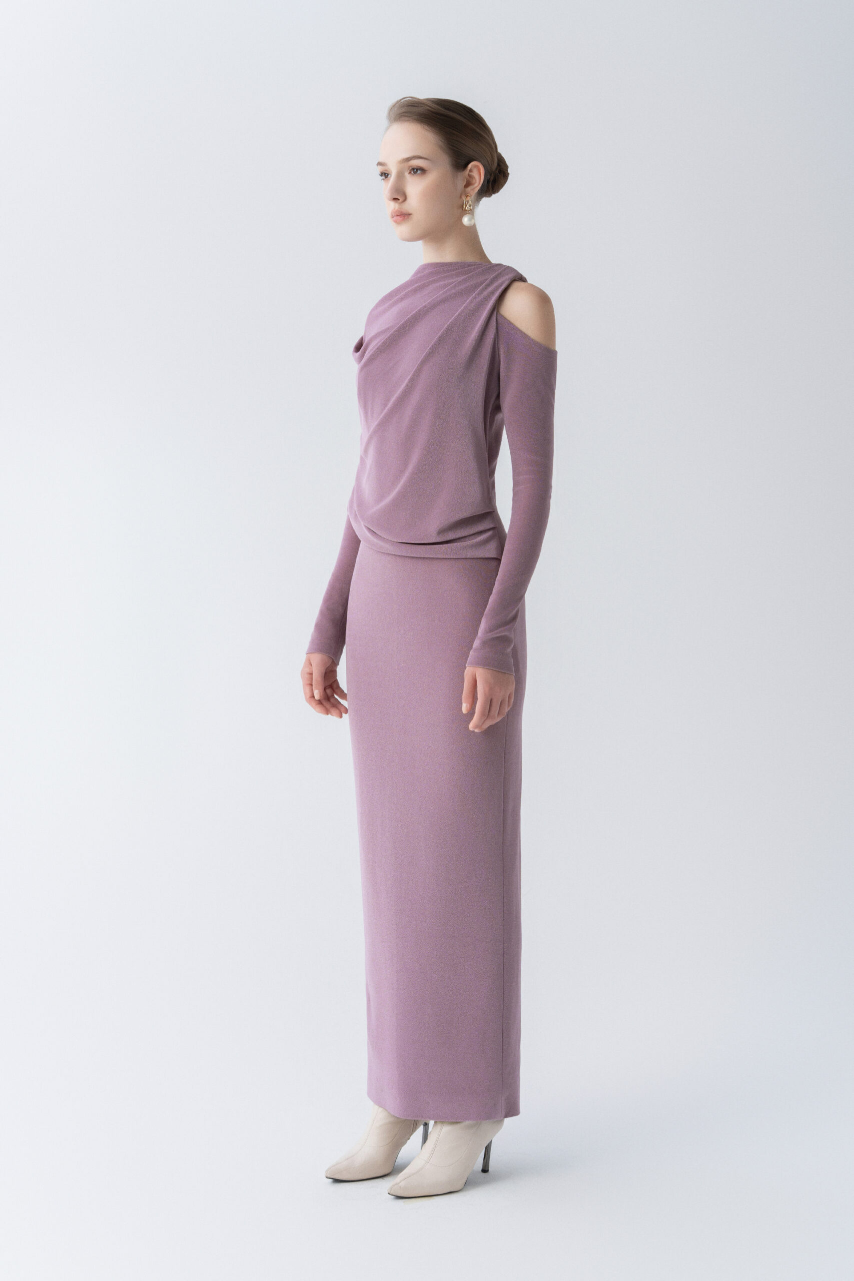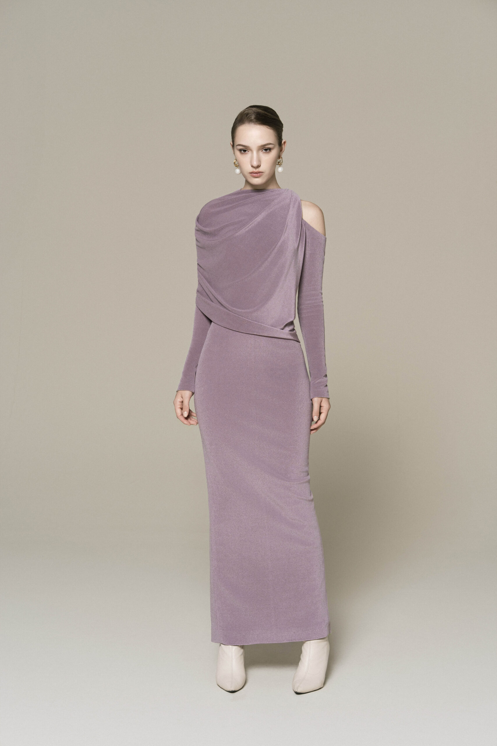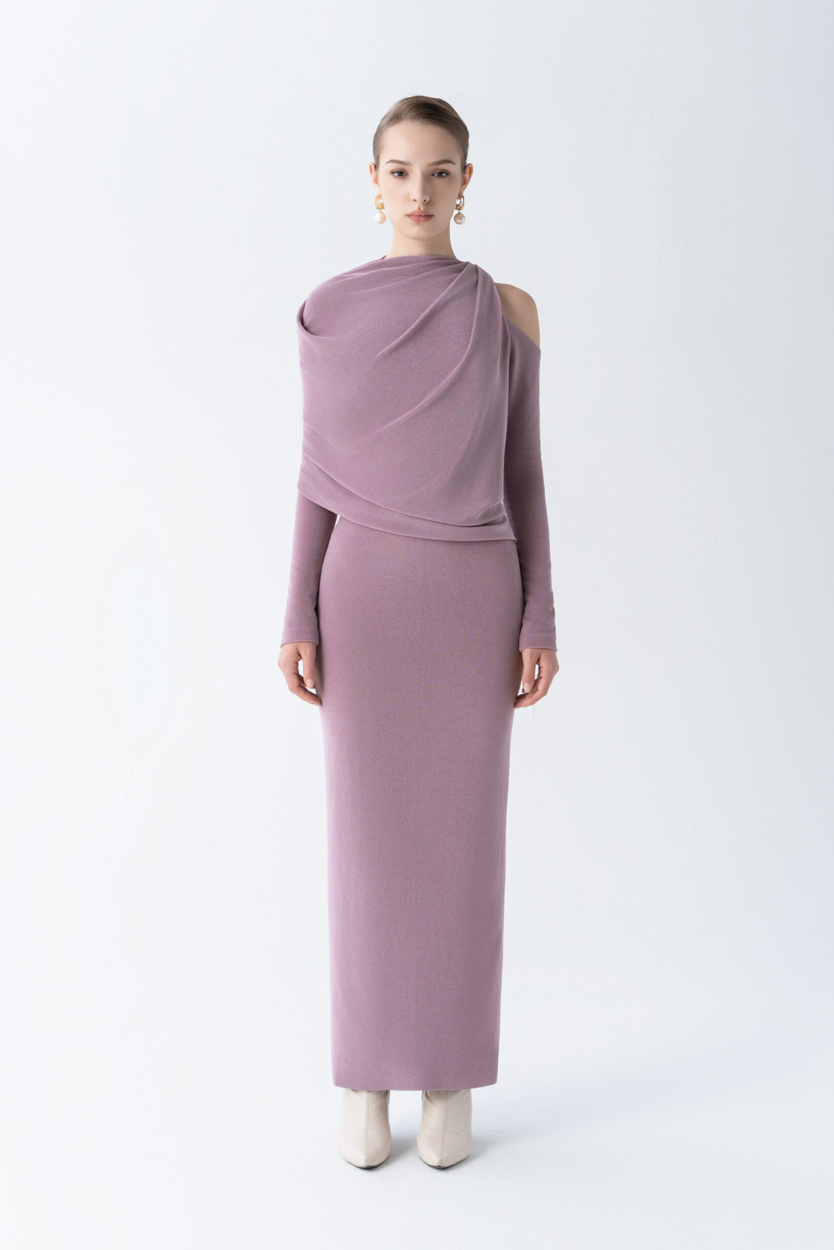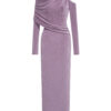 Lightly fitted pencil midi dress with cross-body draped bodice, featuring an asymmetric one-shoulder design.