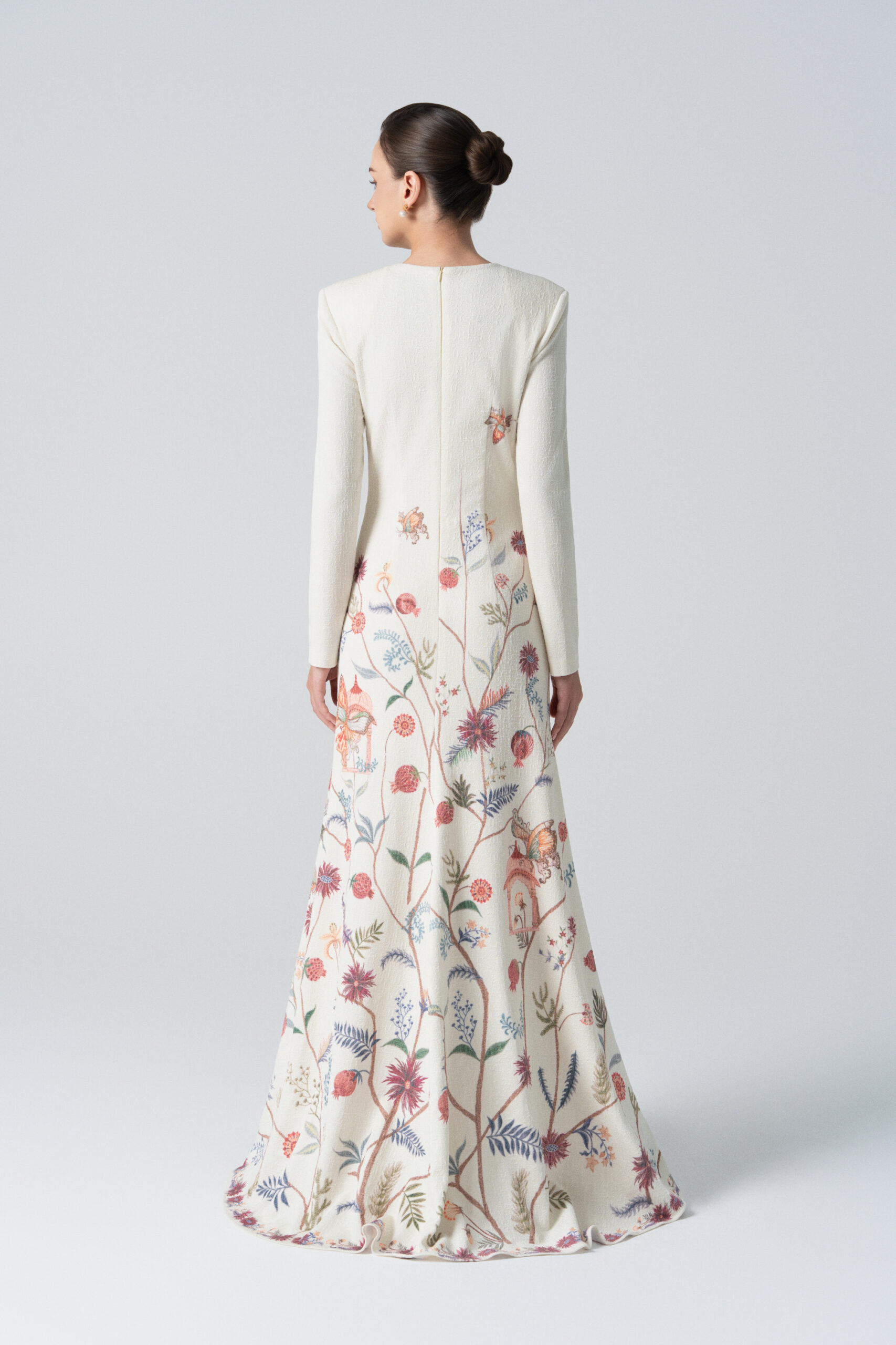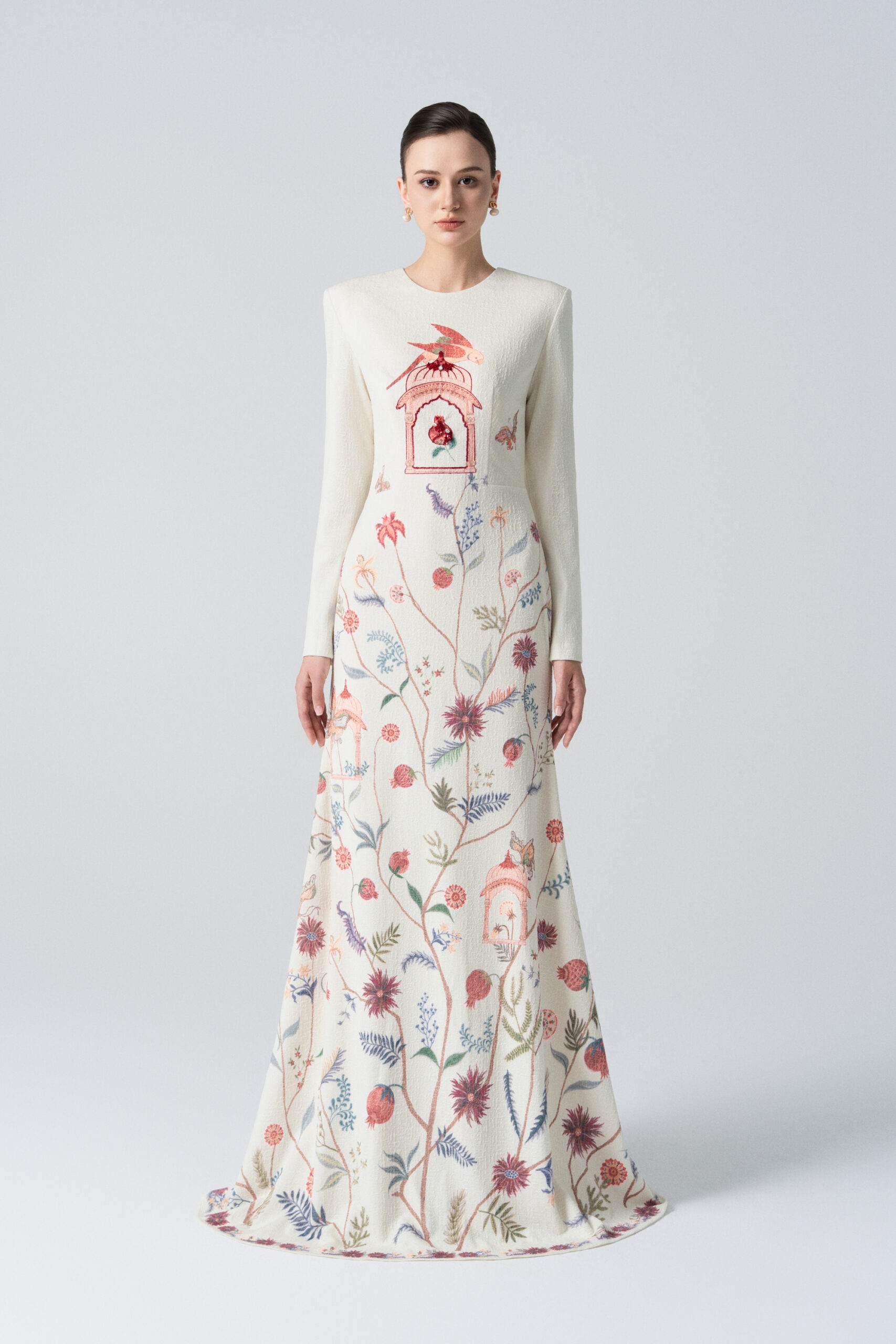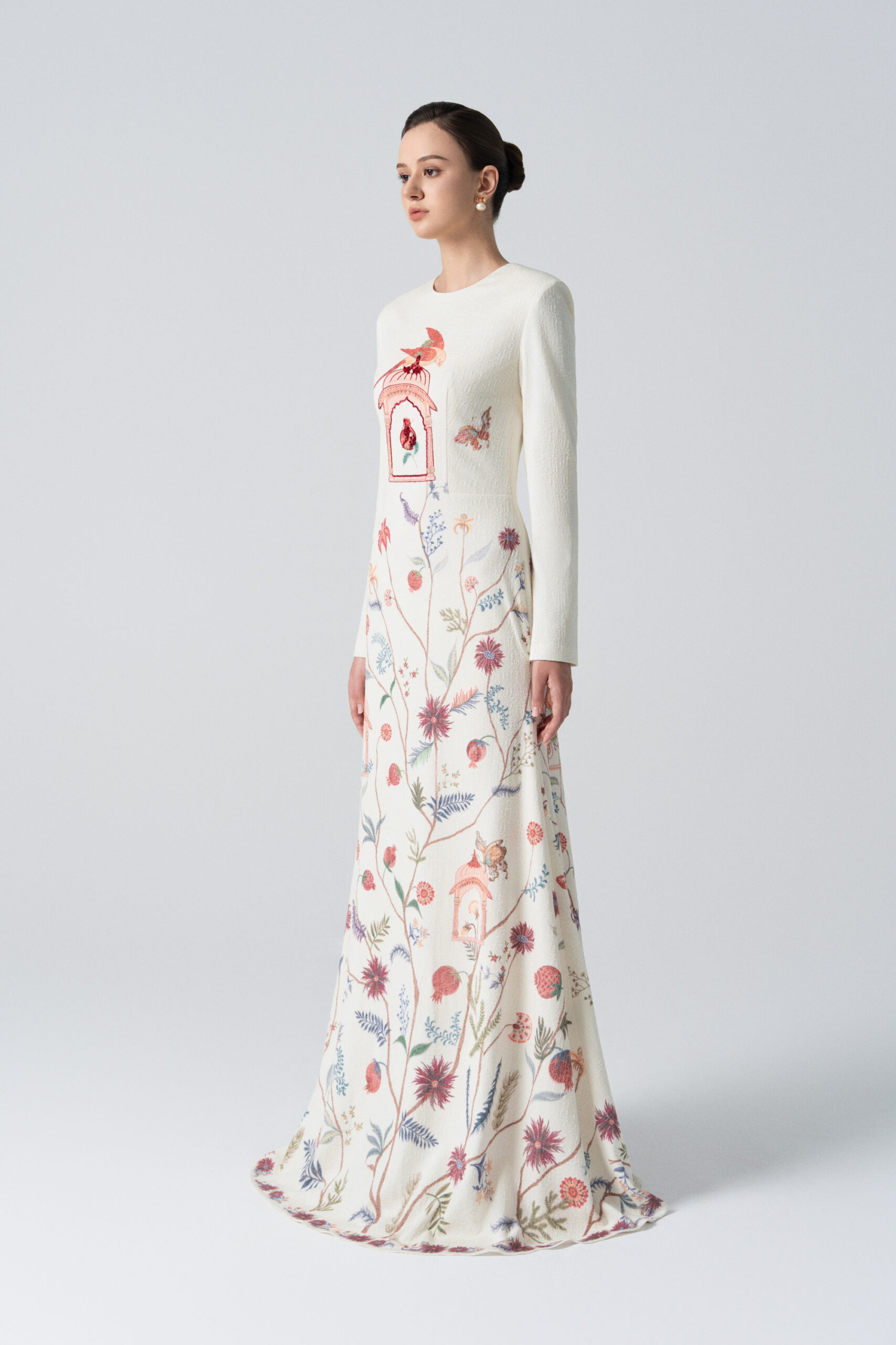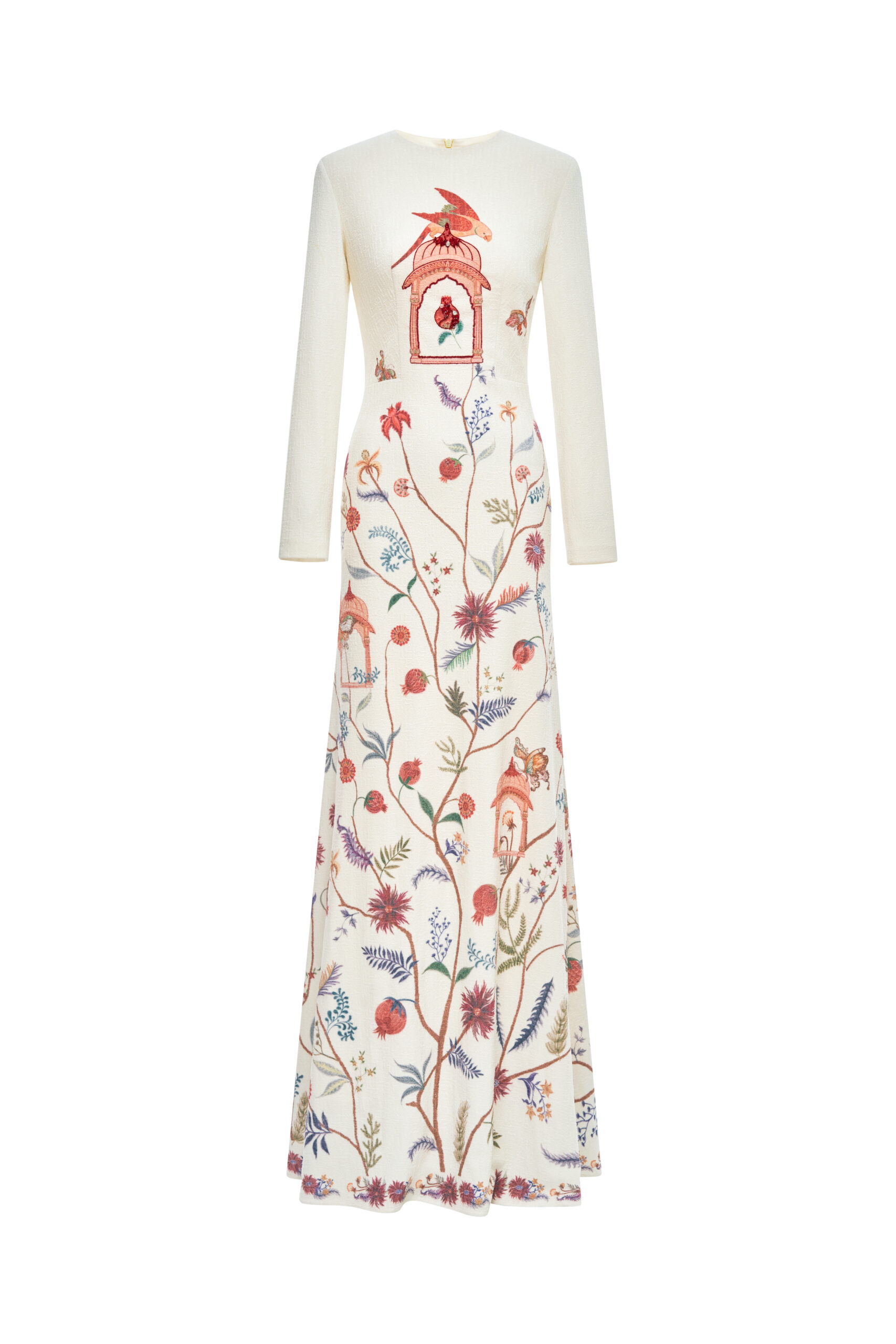 A long-sleeved mermaid-style dress featuring wildflower, leaf, and fruit motifs; embellished with an ornate birdcage detail.