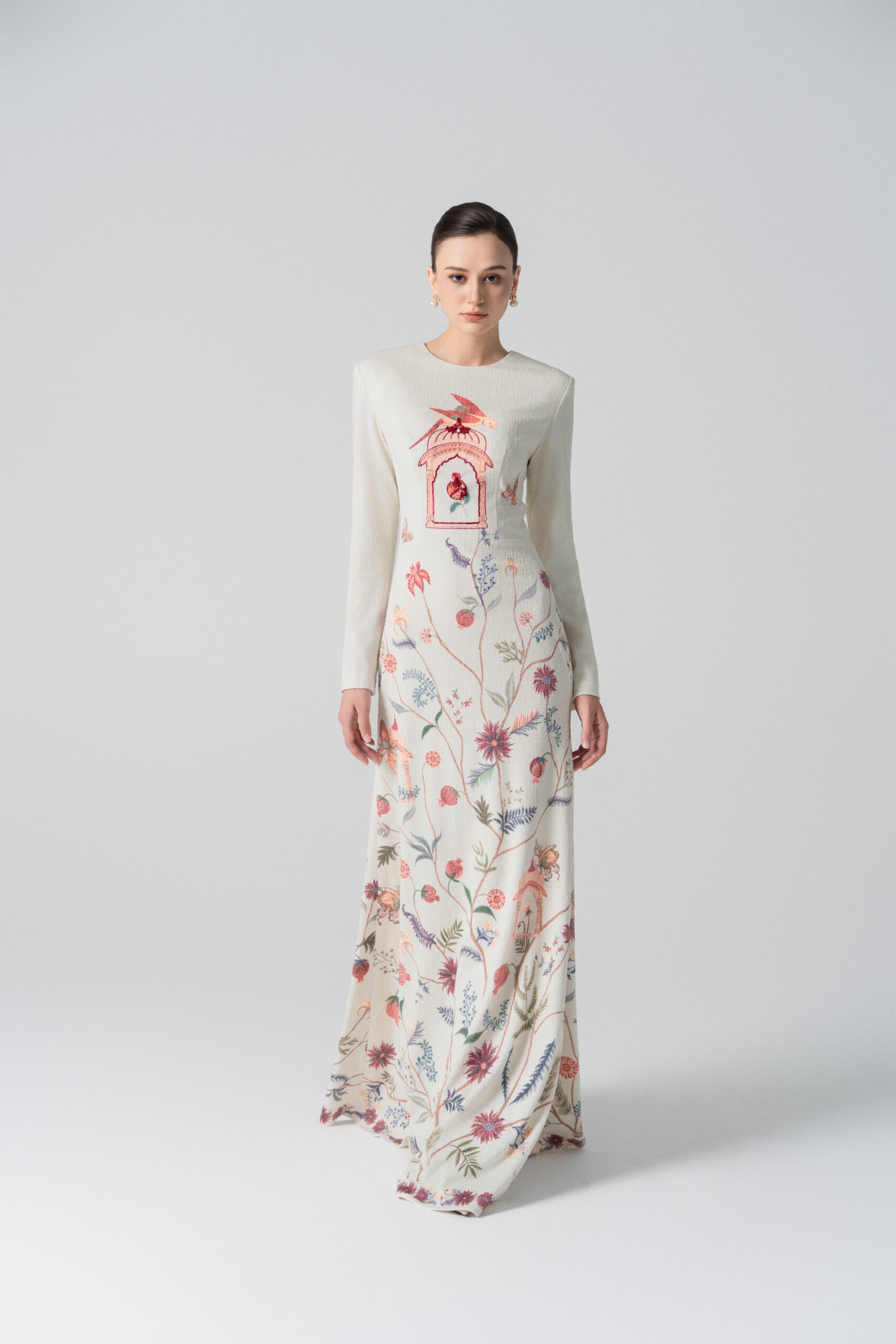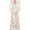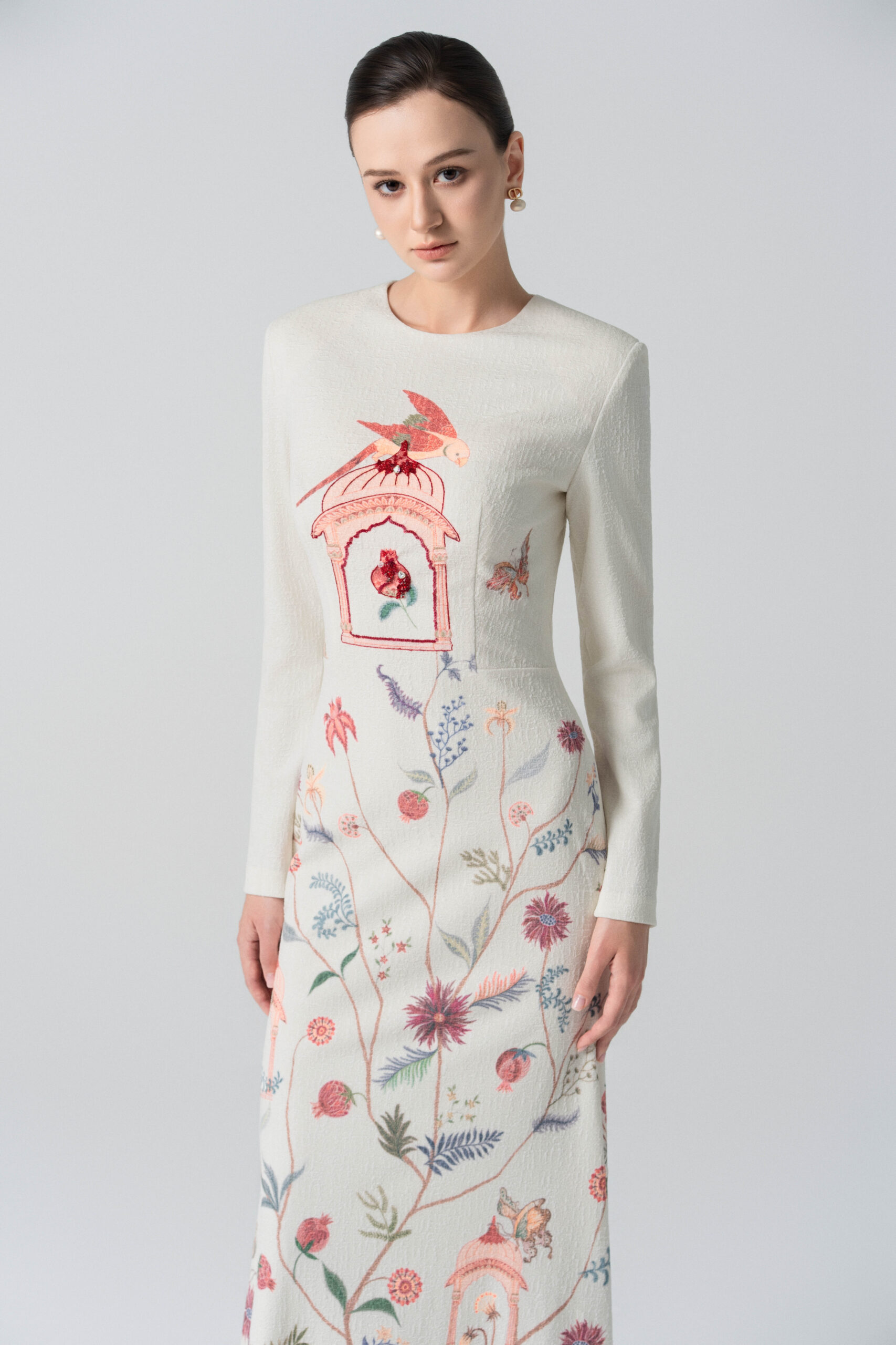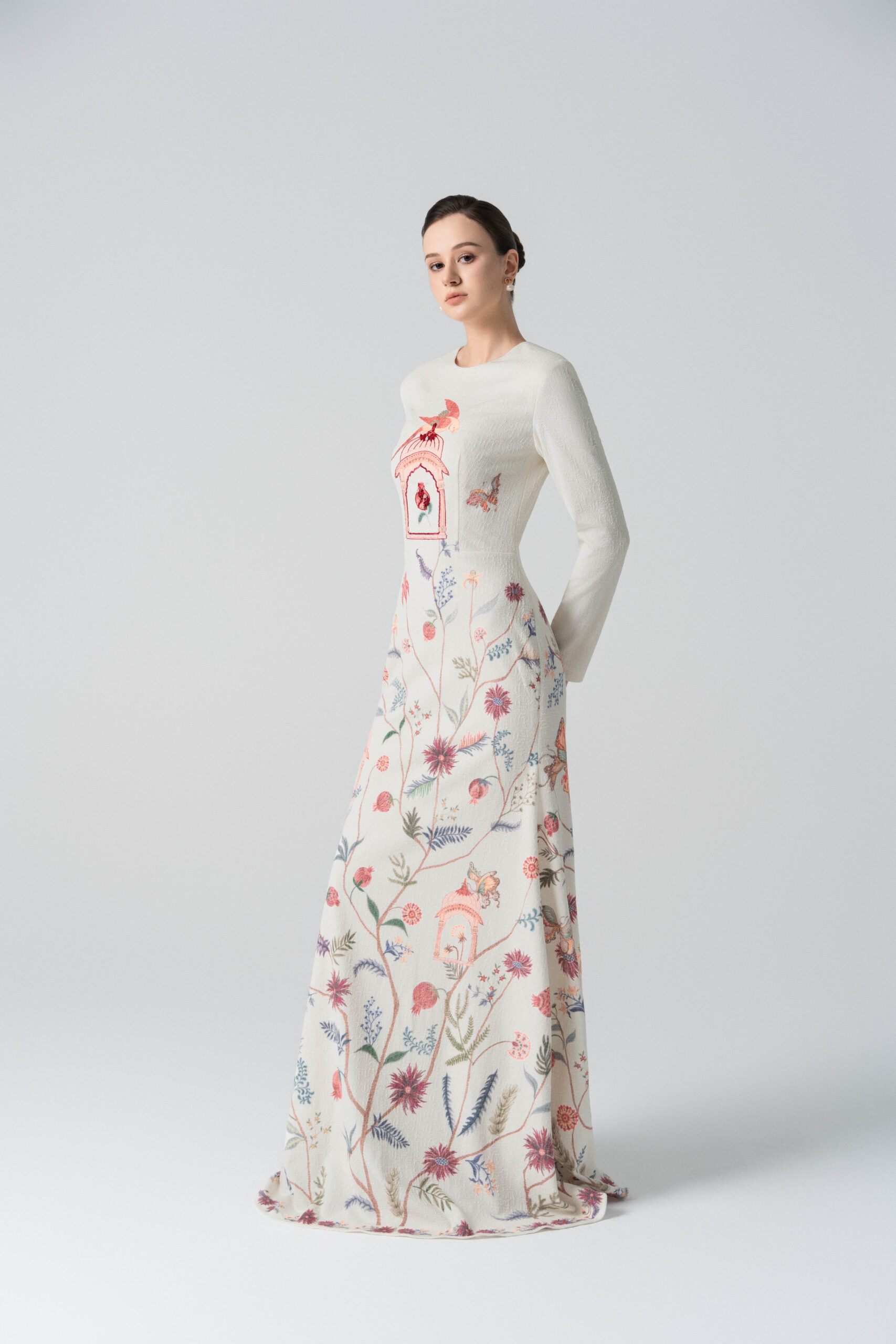 A long-sleeved mermaid-style dress featuring wildflower, leaf, and fruit motifs; embellished with an ornate birdcage detail.