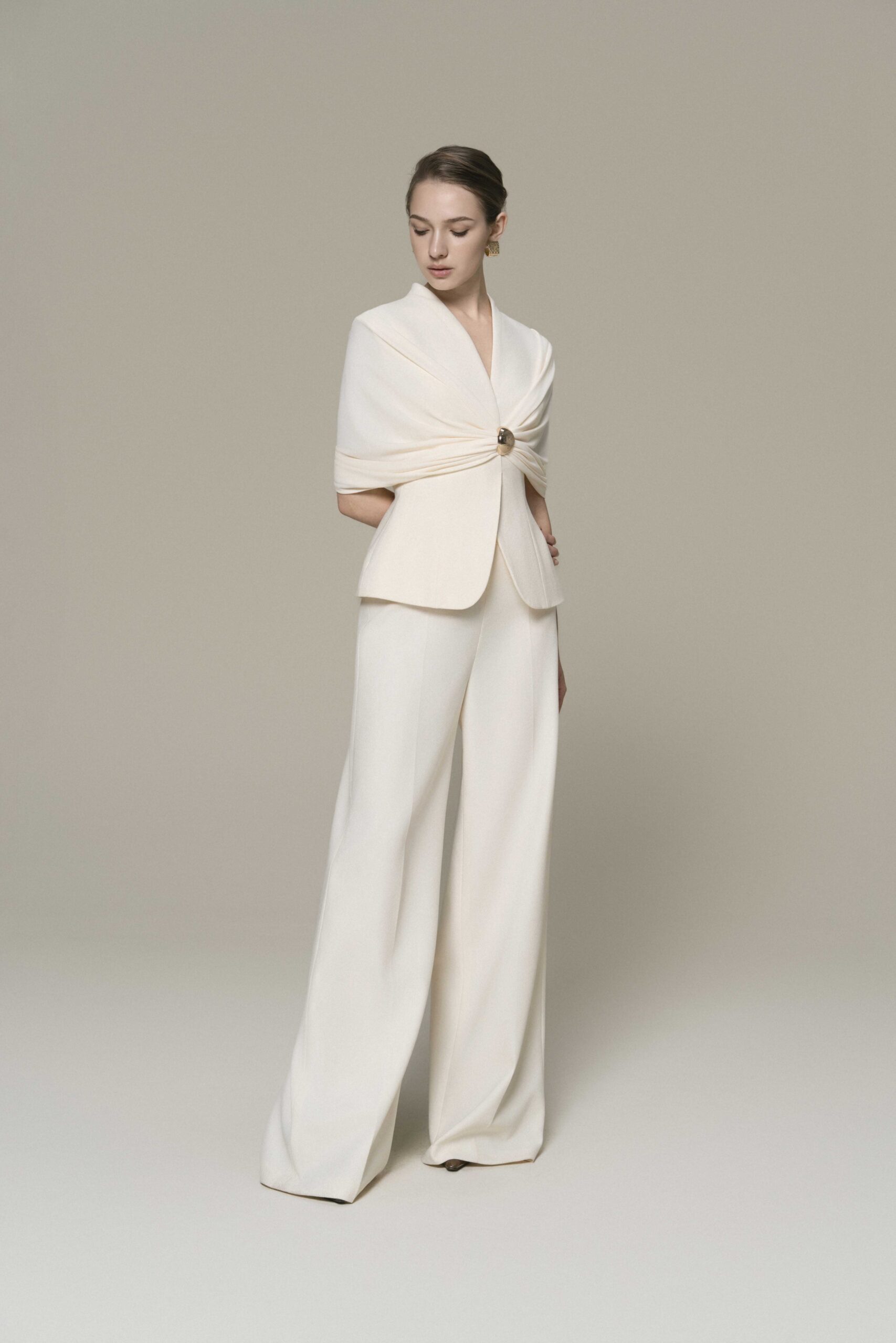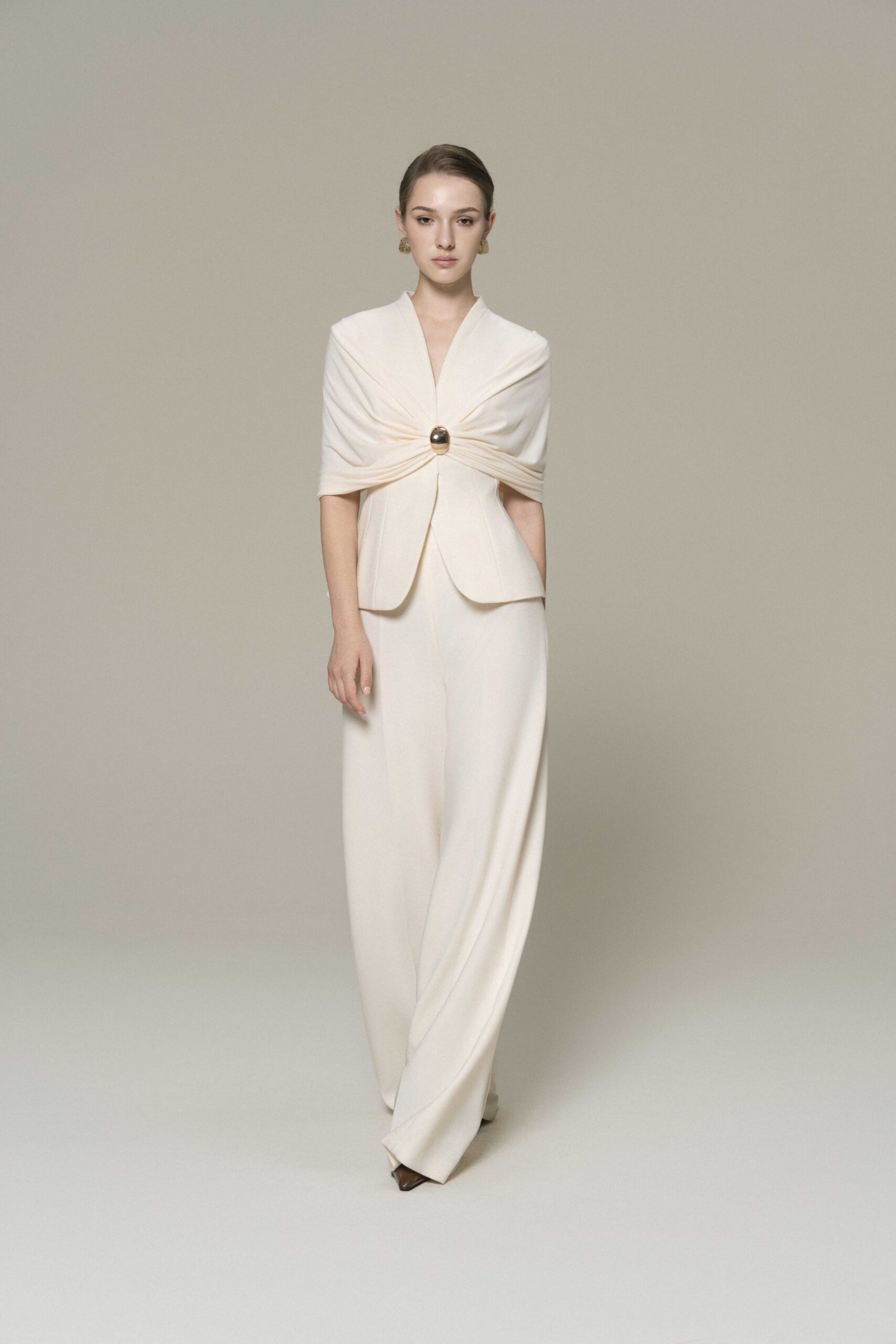 Peplum top with cinched waist, draped shoulder, metallic ring detail; paired with tailored pants with clean pressed pleats.