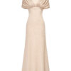 An evening gown with a draped bodice that crosses from shoulder to chest, featuring a mermaid silhouette that gently hugs the hips.