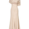 An off-shoulder midi cut-out dress with asymmetric draping: one side features a short 3D draped sleeve creating a puffed silhouette, while the other side is cross-pleated over the shoulder. The mermaid-style skirt flares gently with a graceful bias-cut, highlighting an elegant look.