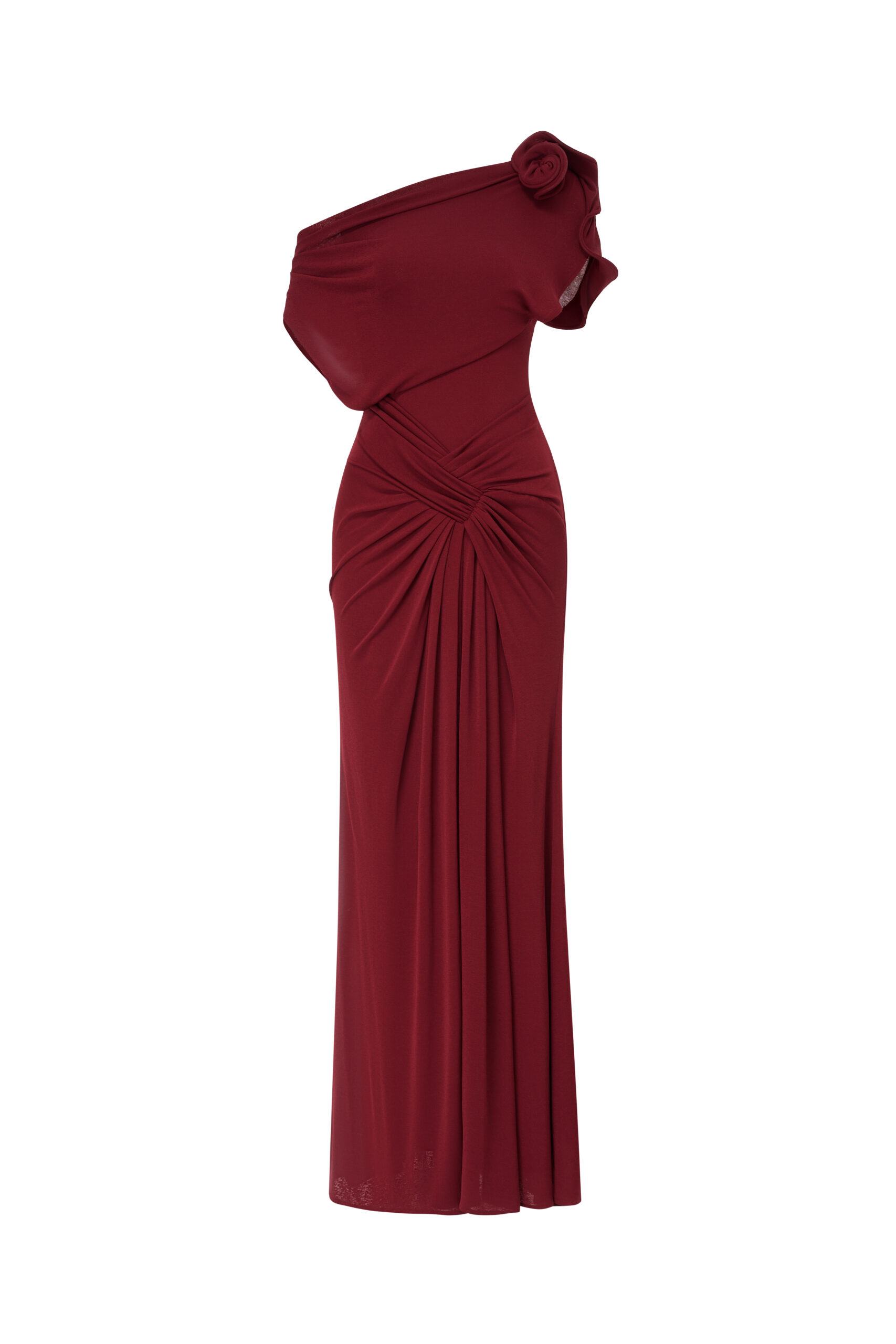 A mermaid-style evening gown with an off-shoulder design, accented by a sculpted floral detail on the shoulder. The bodice features complex pleating that intersects gracefully at the hips, creating a cinched waist effect and flattering the silhouette.