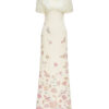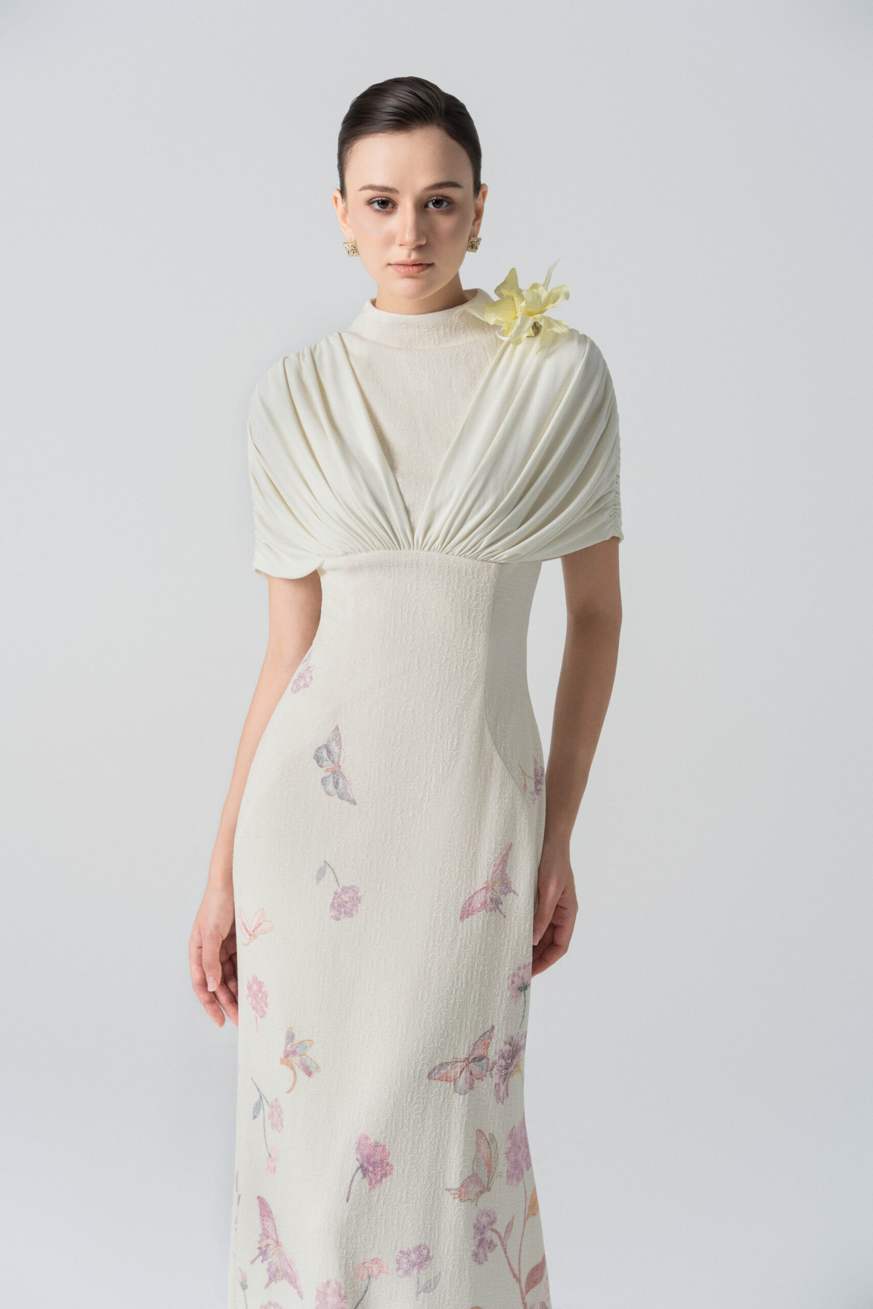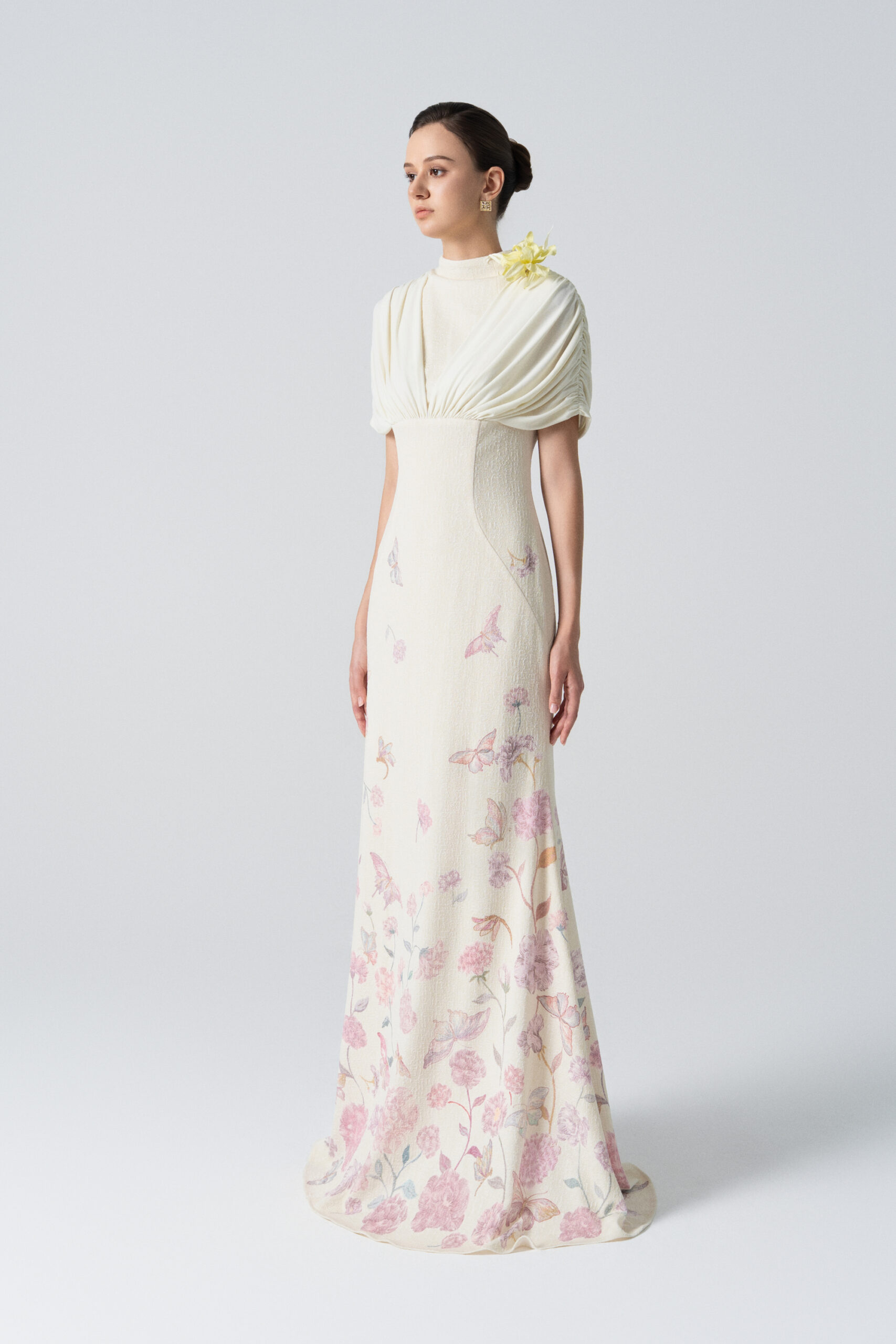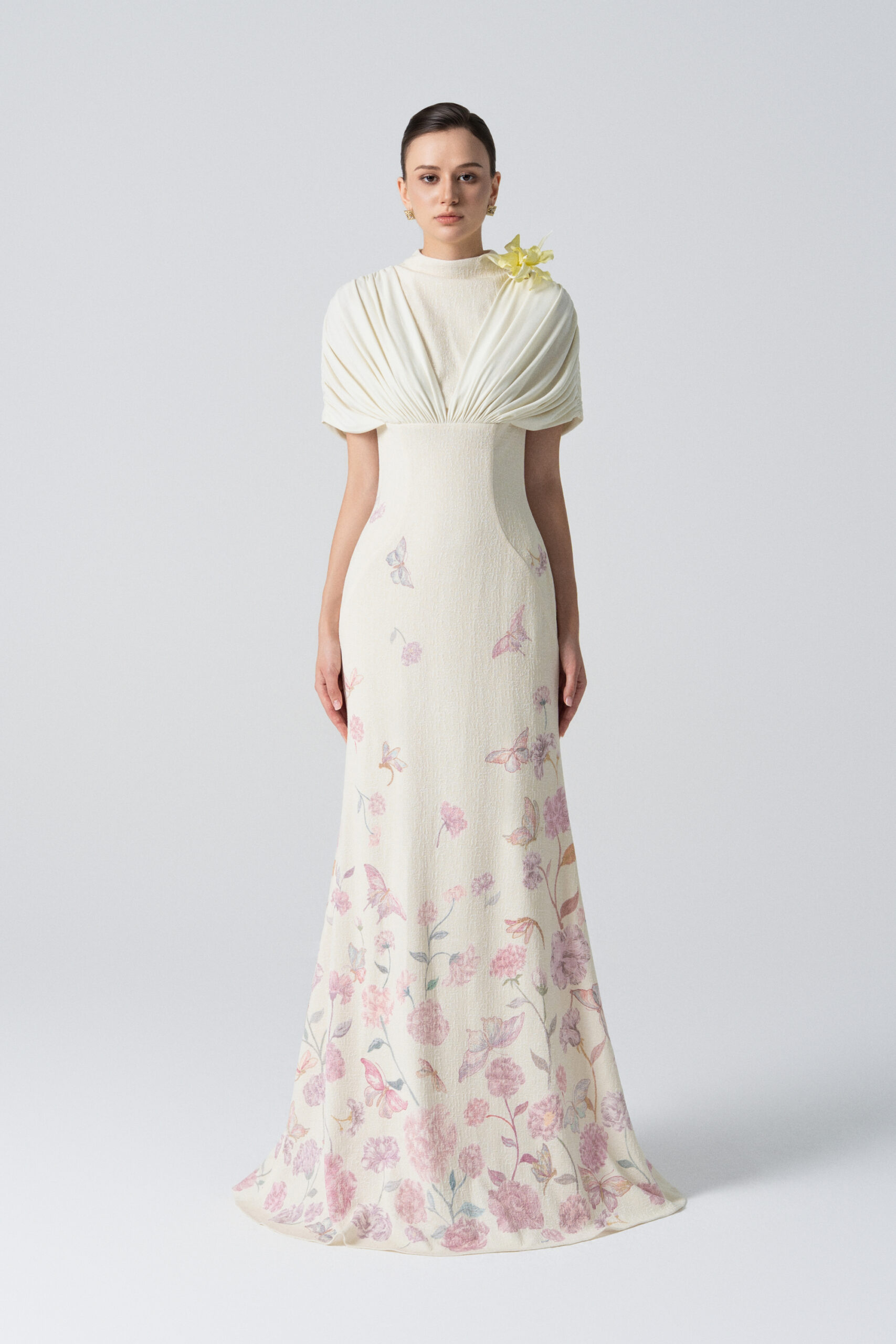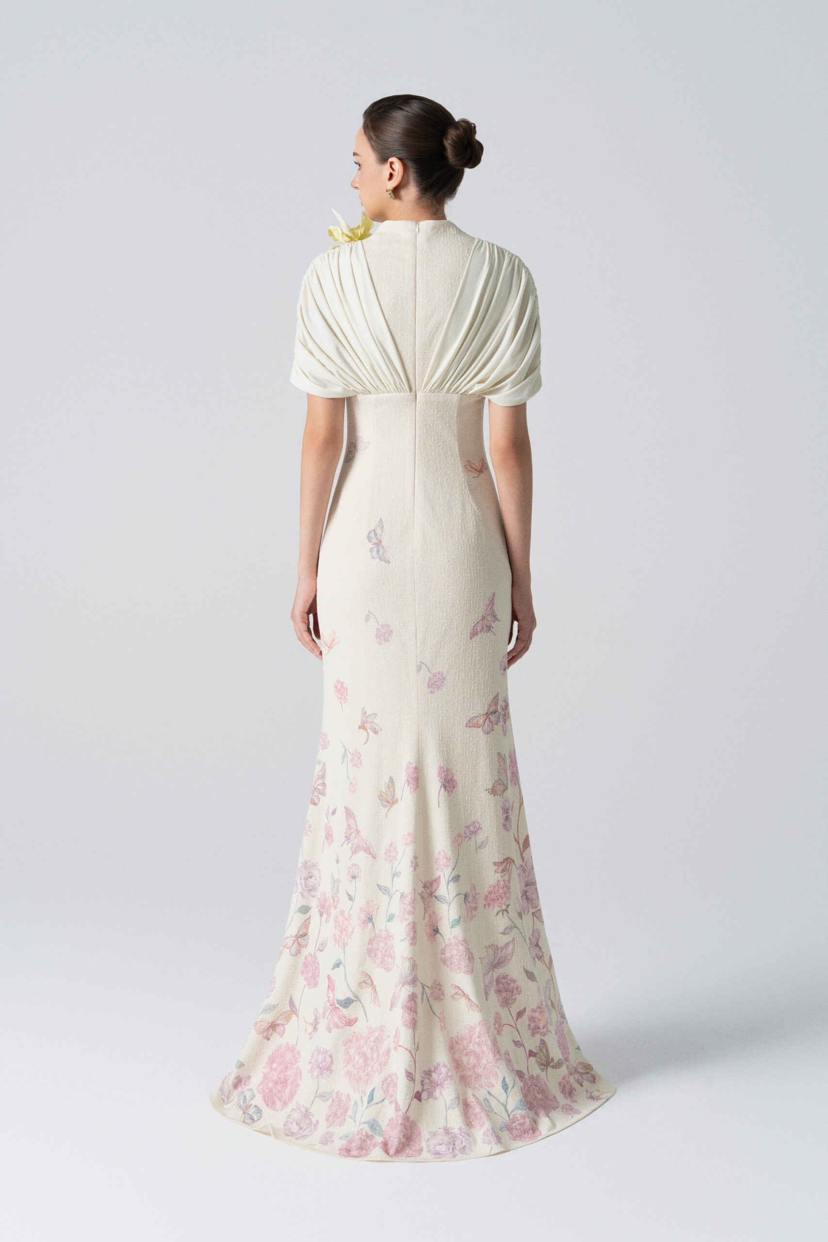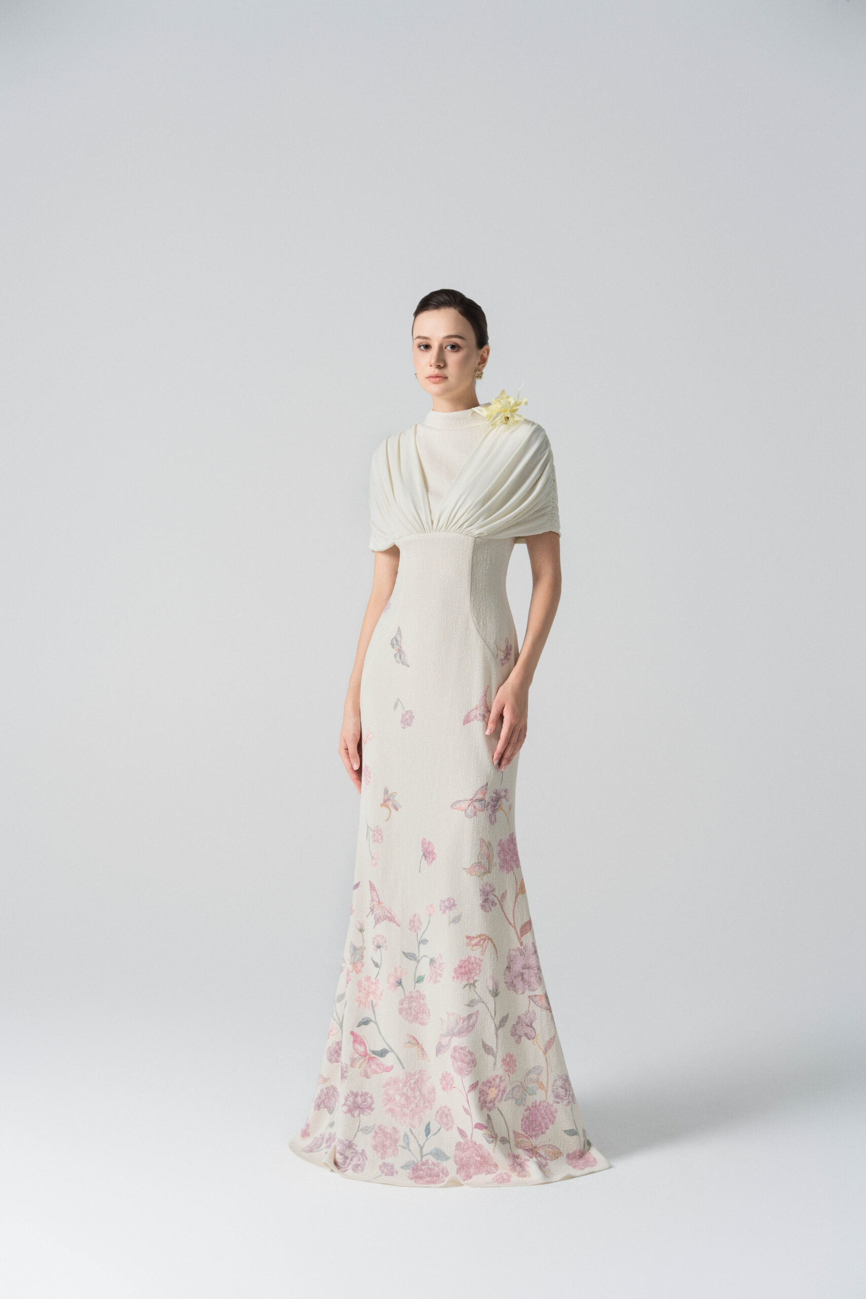 A form-fitting mermaid dress with draping from the shoulder across the bust; floral and butterfly motifs cascading down the body.