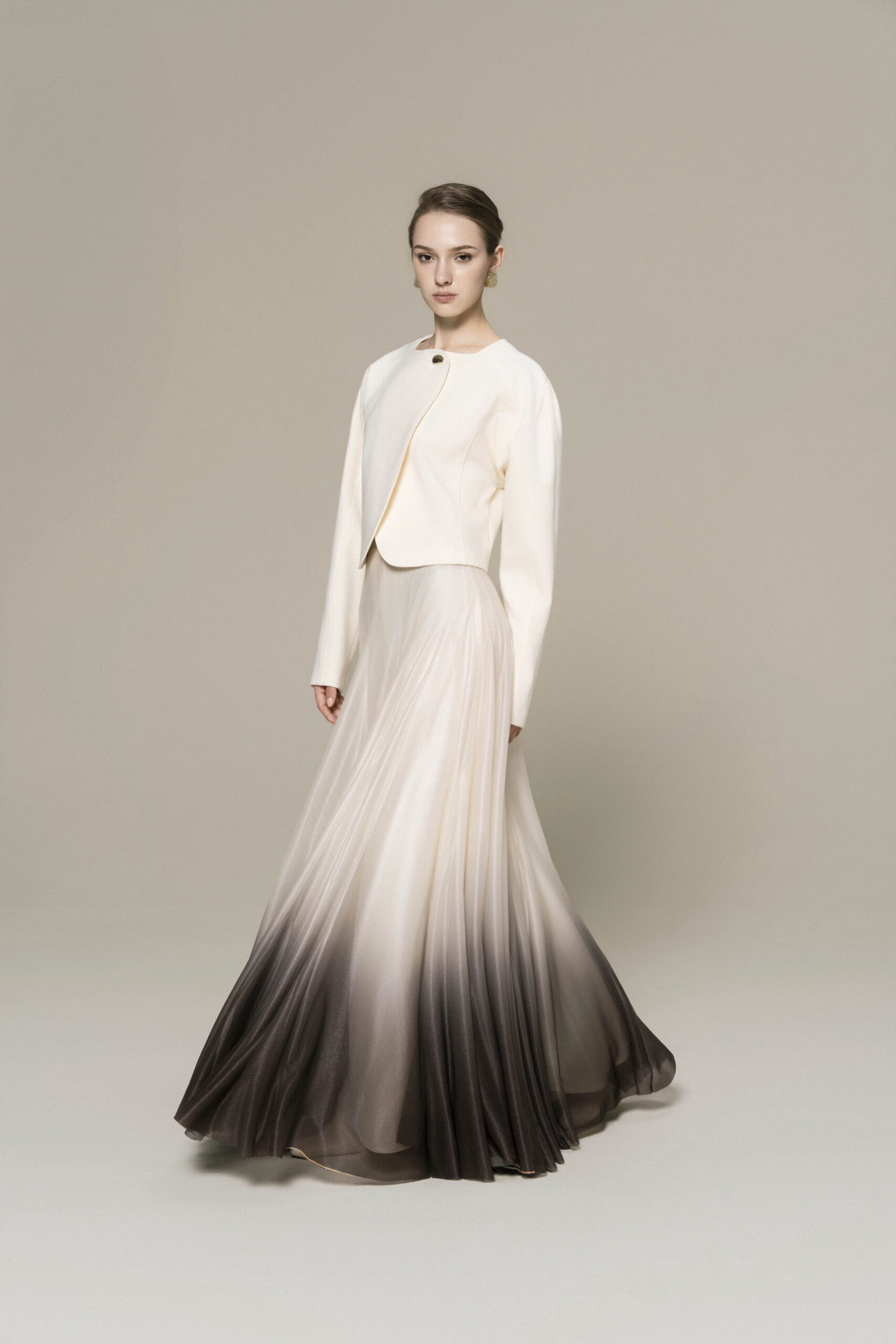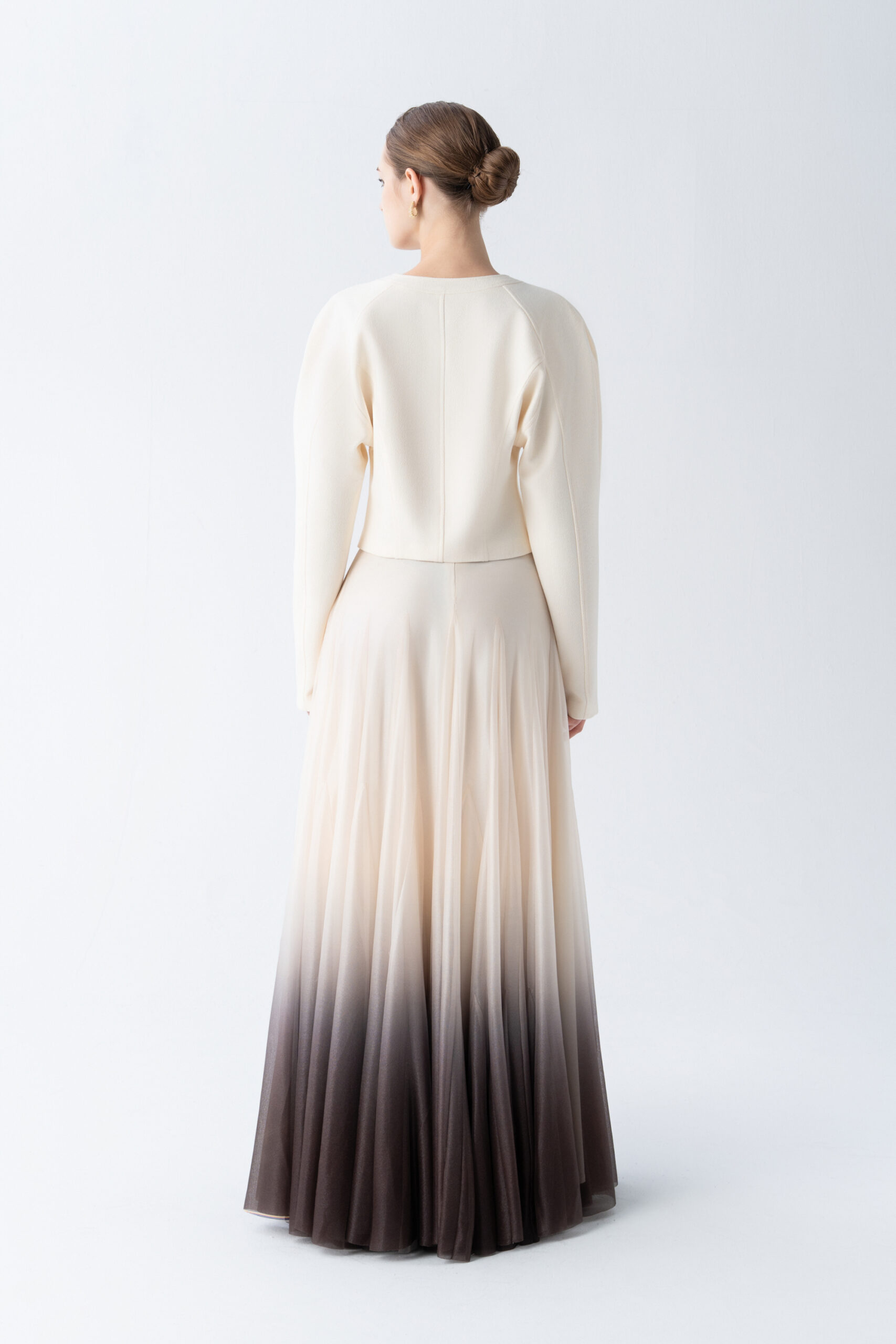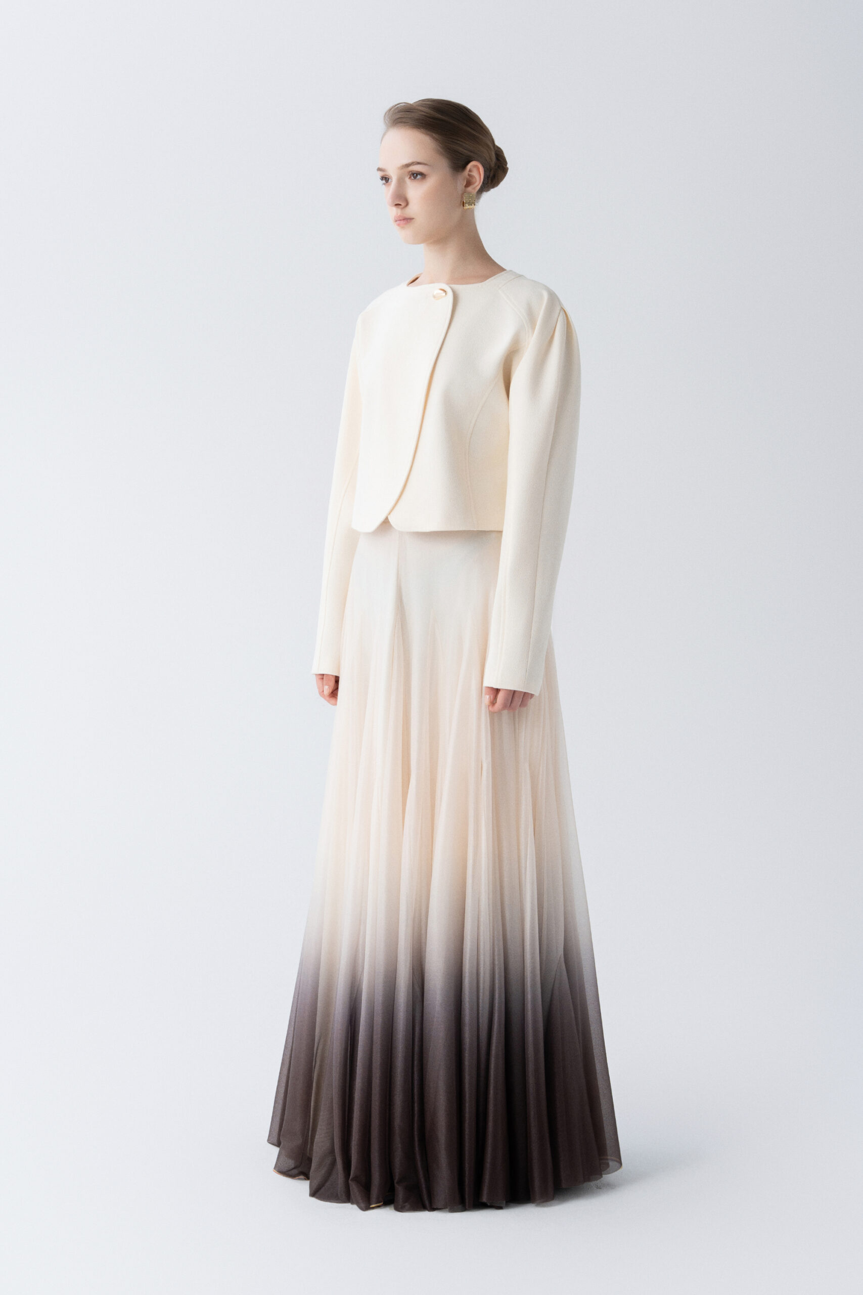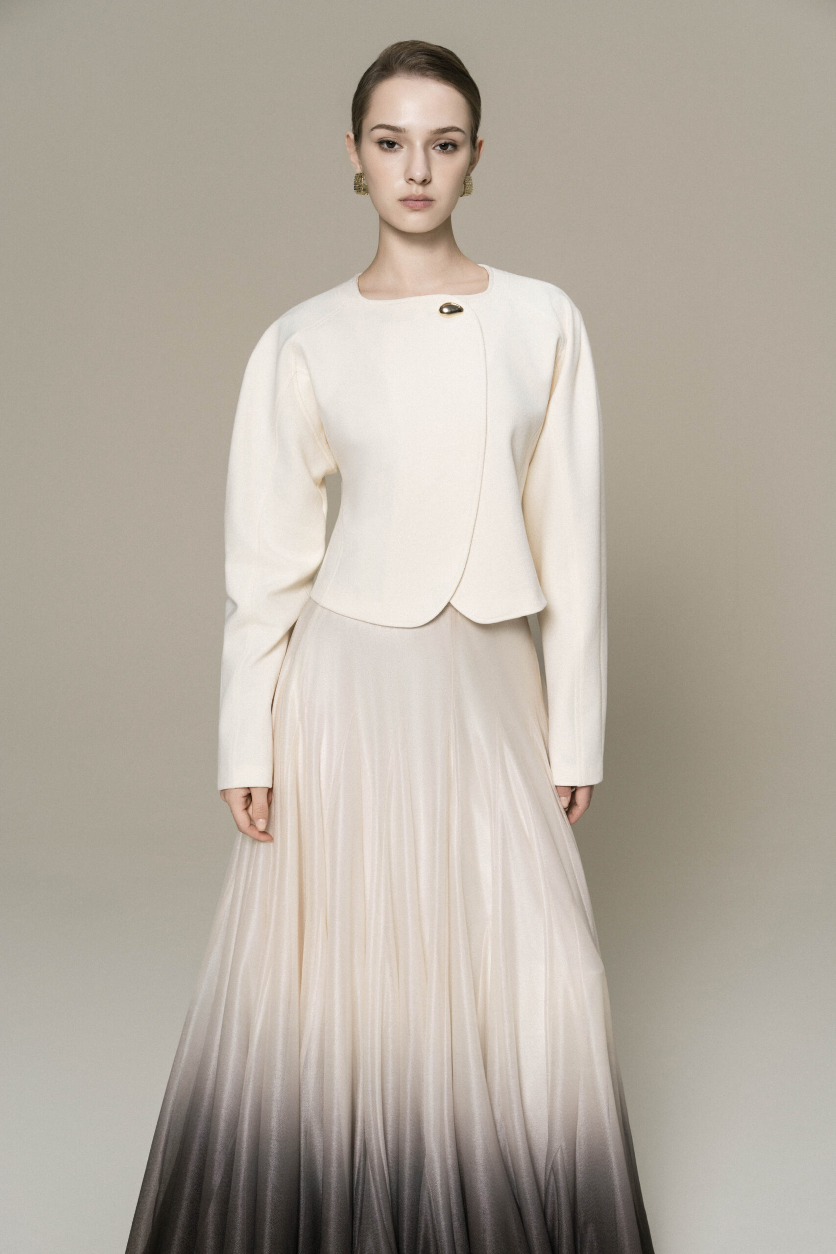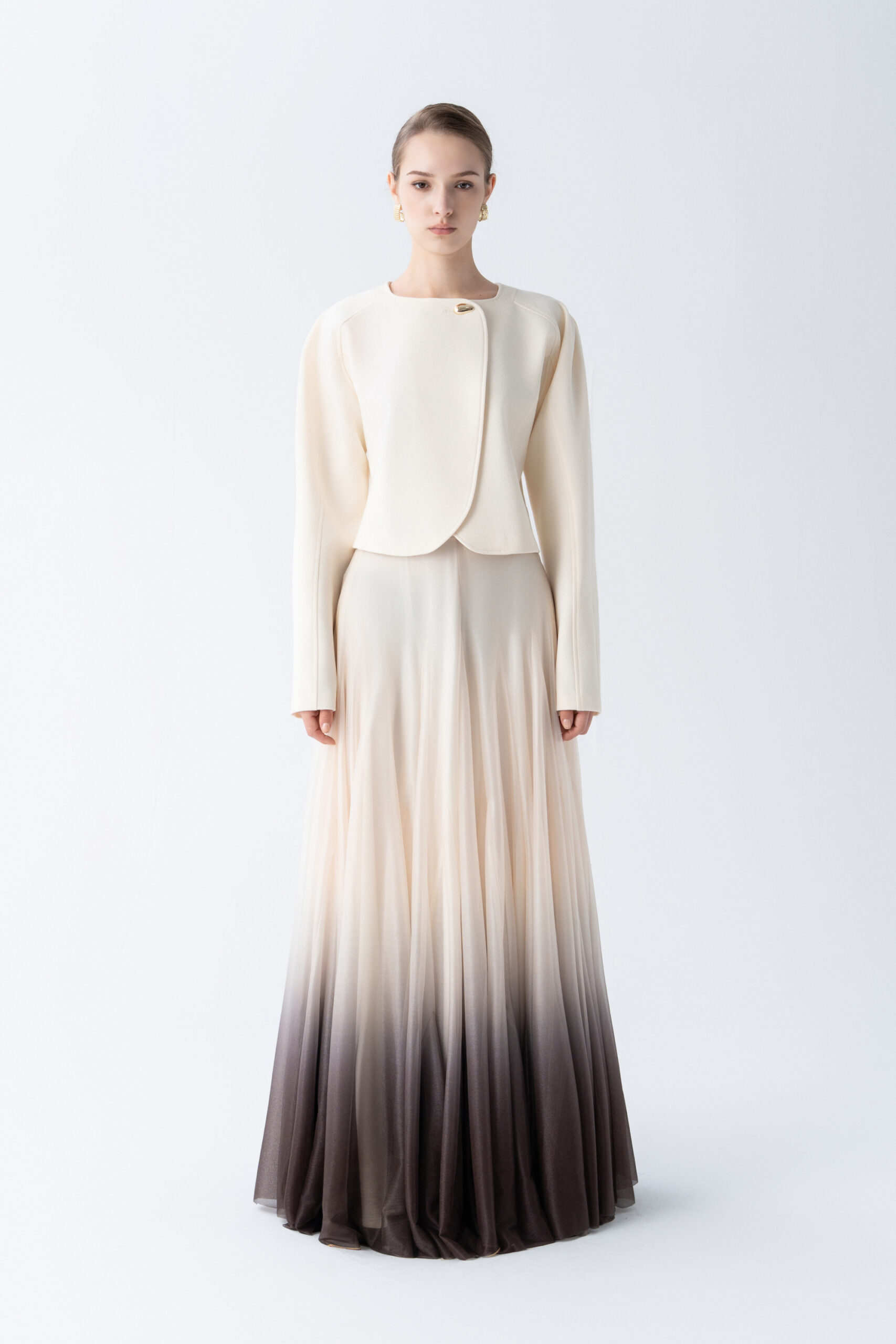 Puffed shoulder cropped jacket with curved hem, metallic button; paired with floor length A-line ombre skirt.