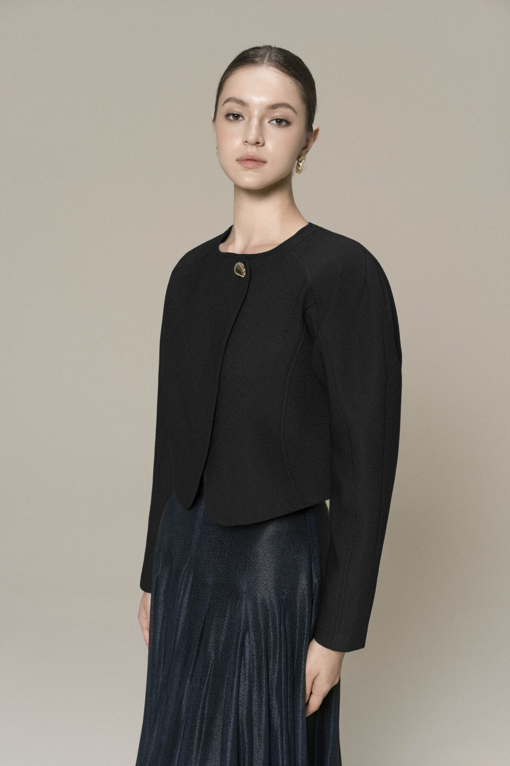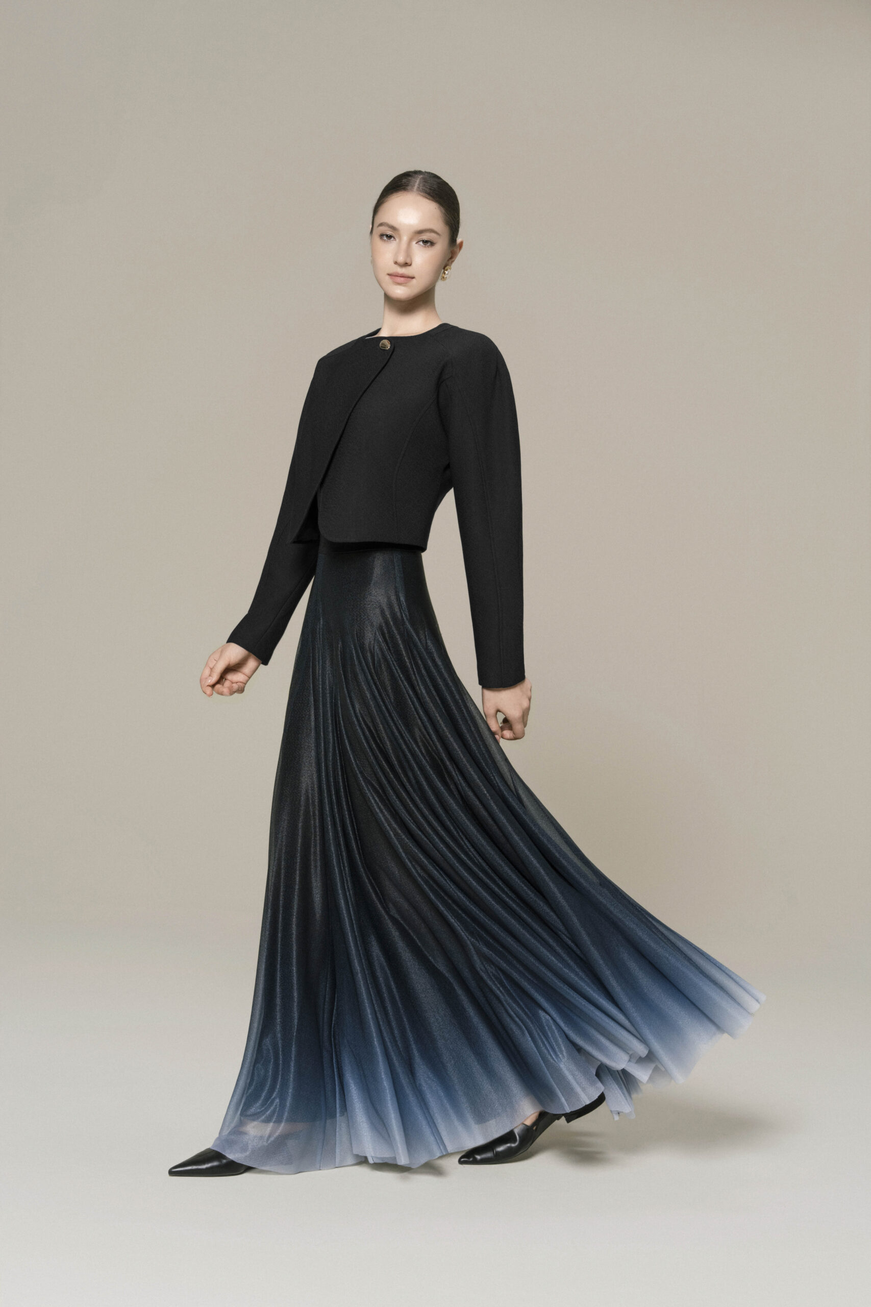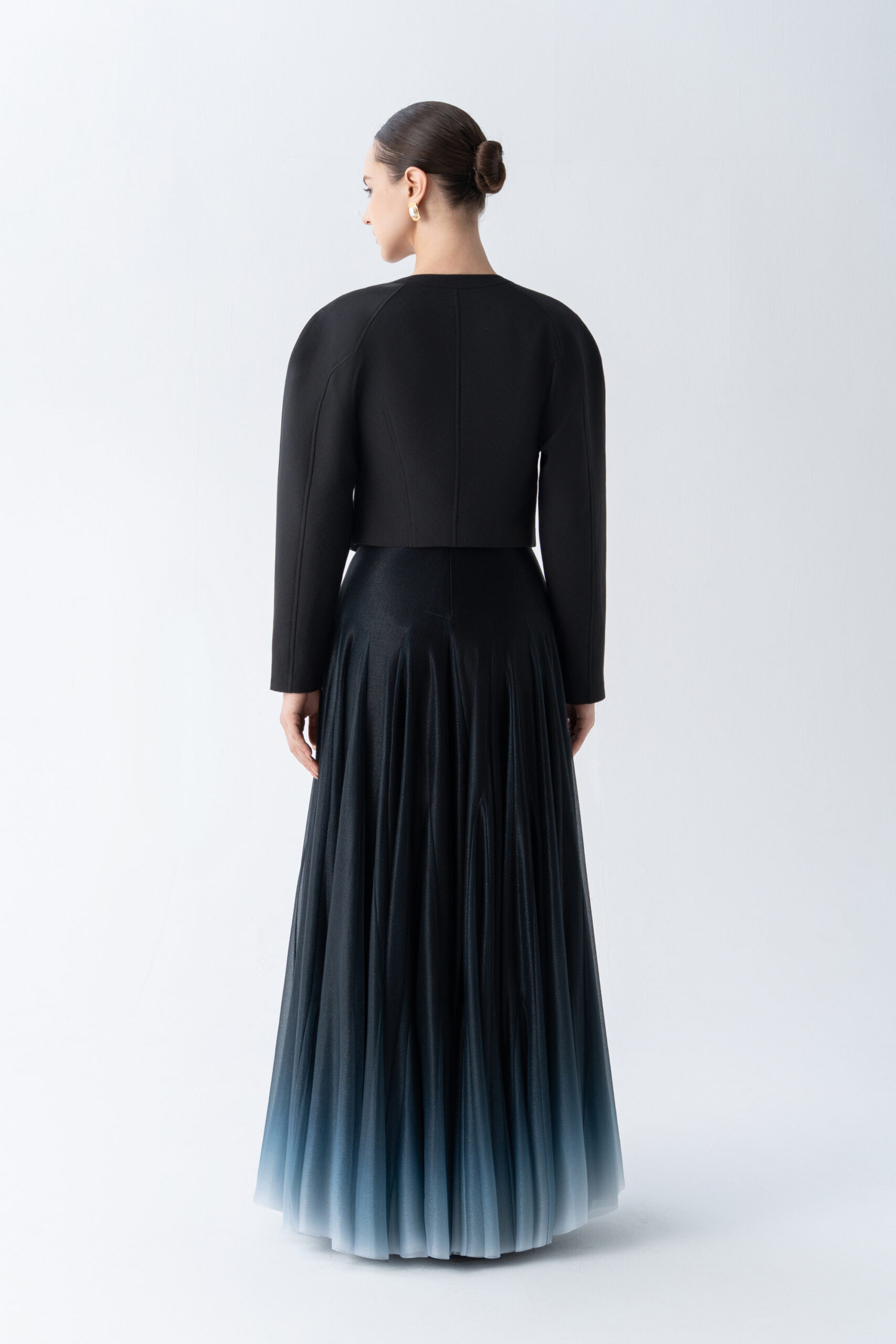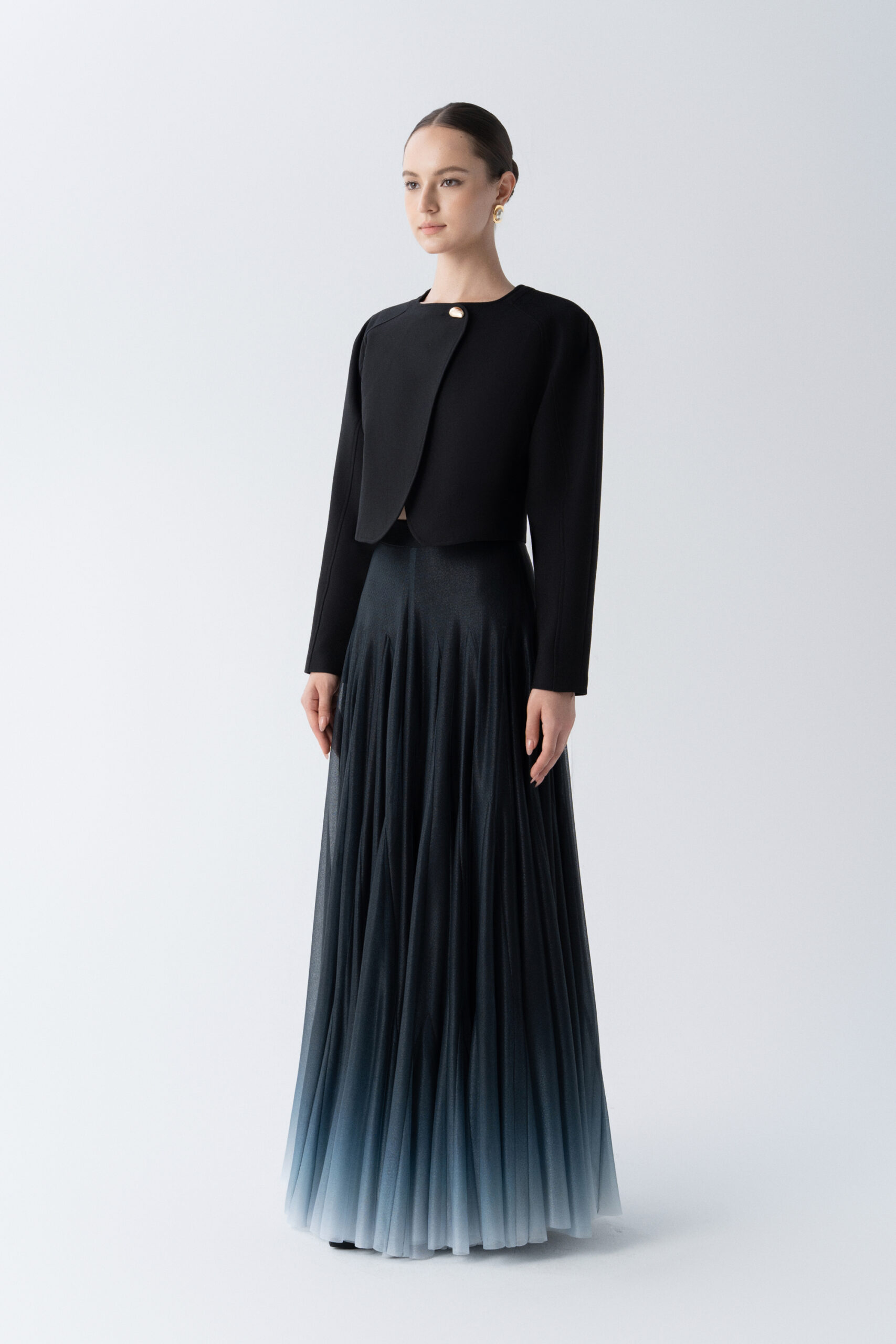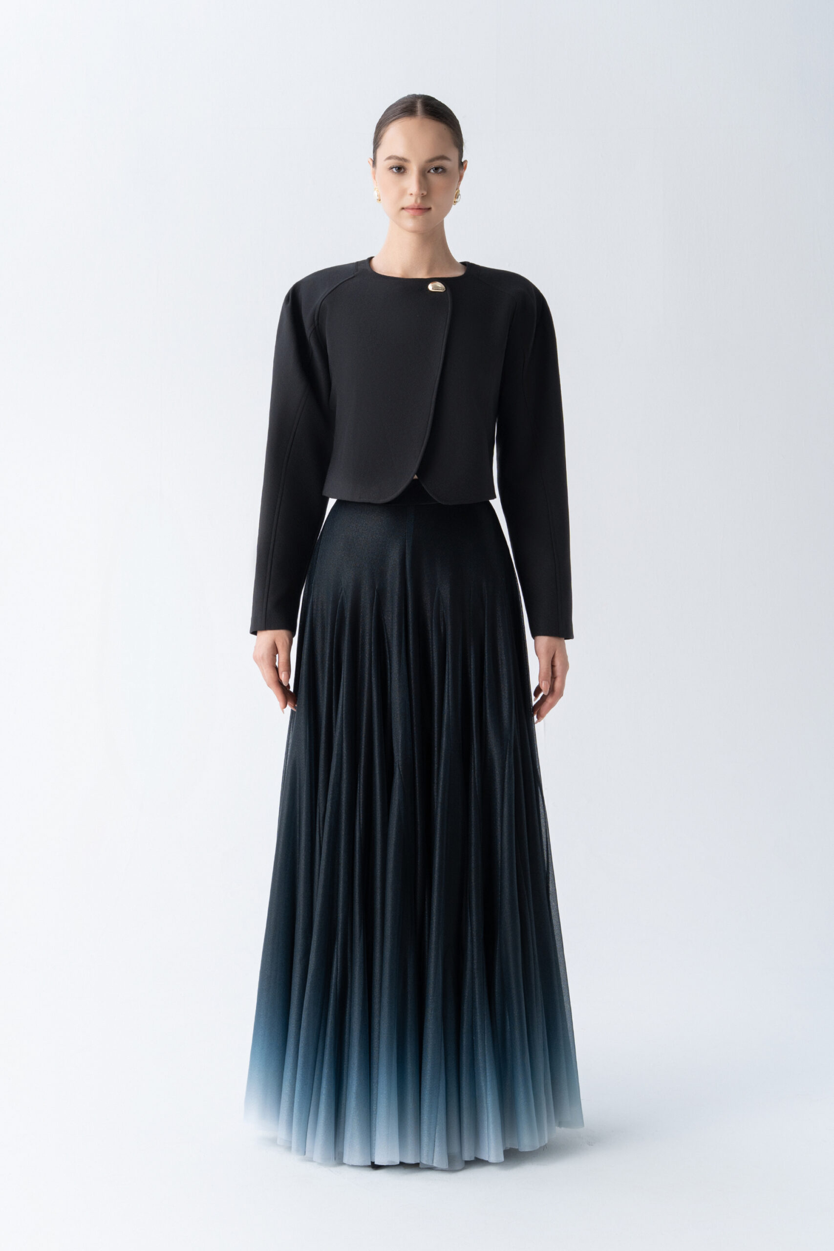 Puffed shoulder cropped jacket with curved hem, metallic button; paired with floor length A-line ombre skirt.