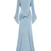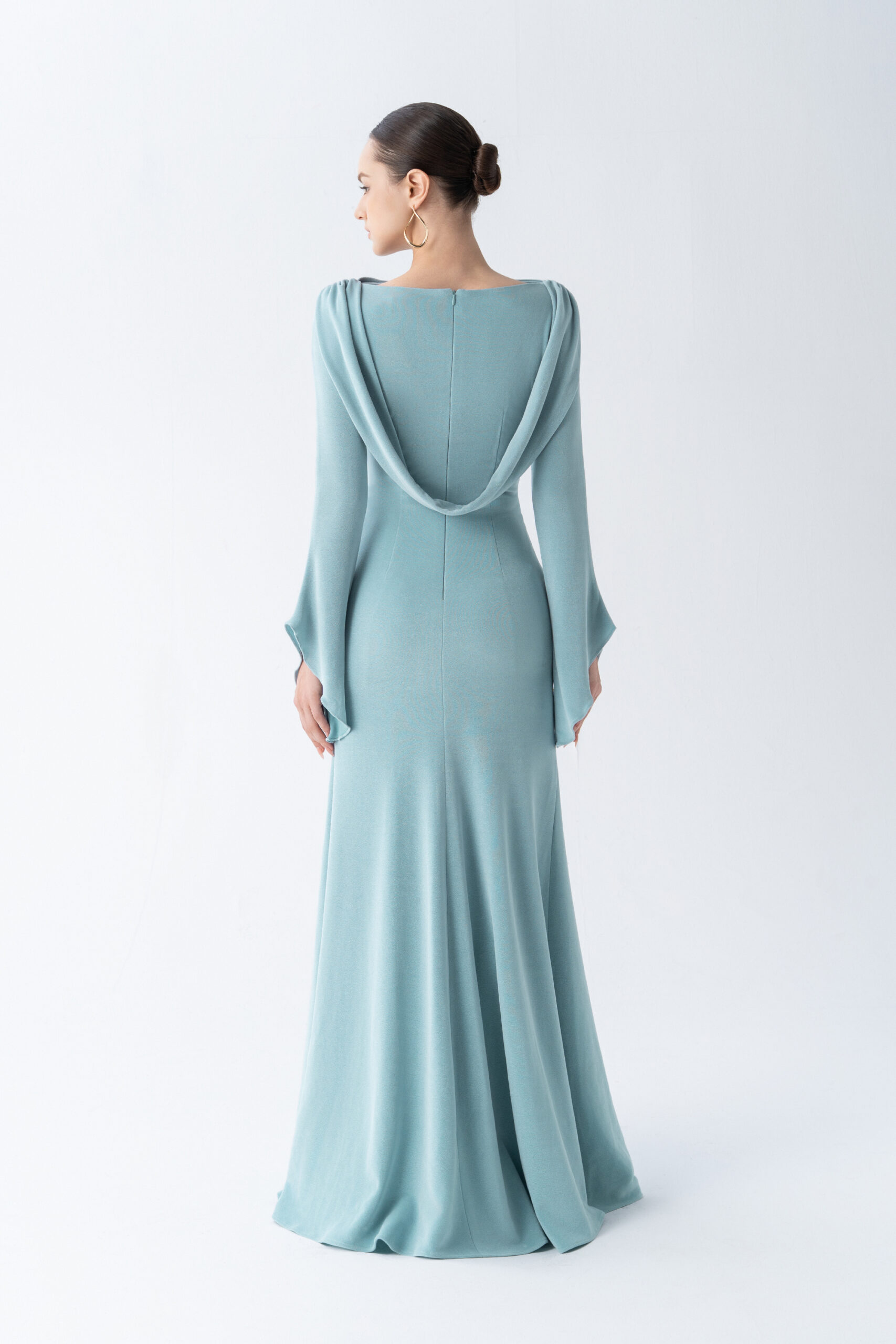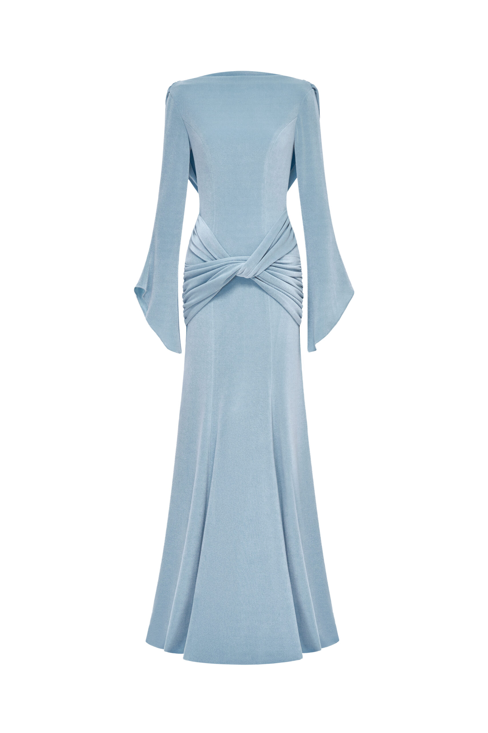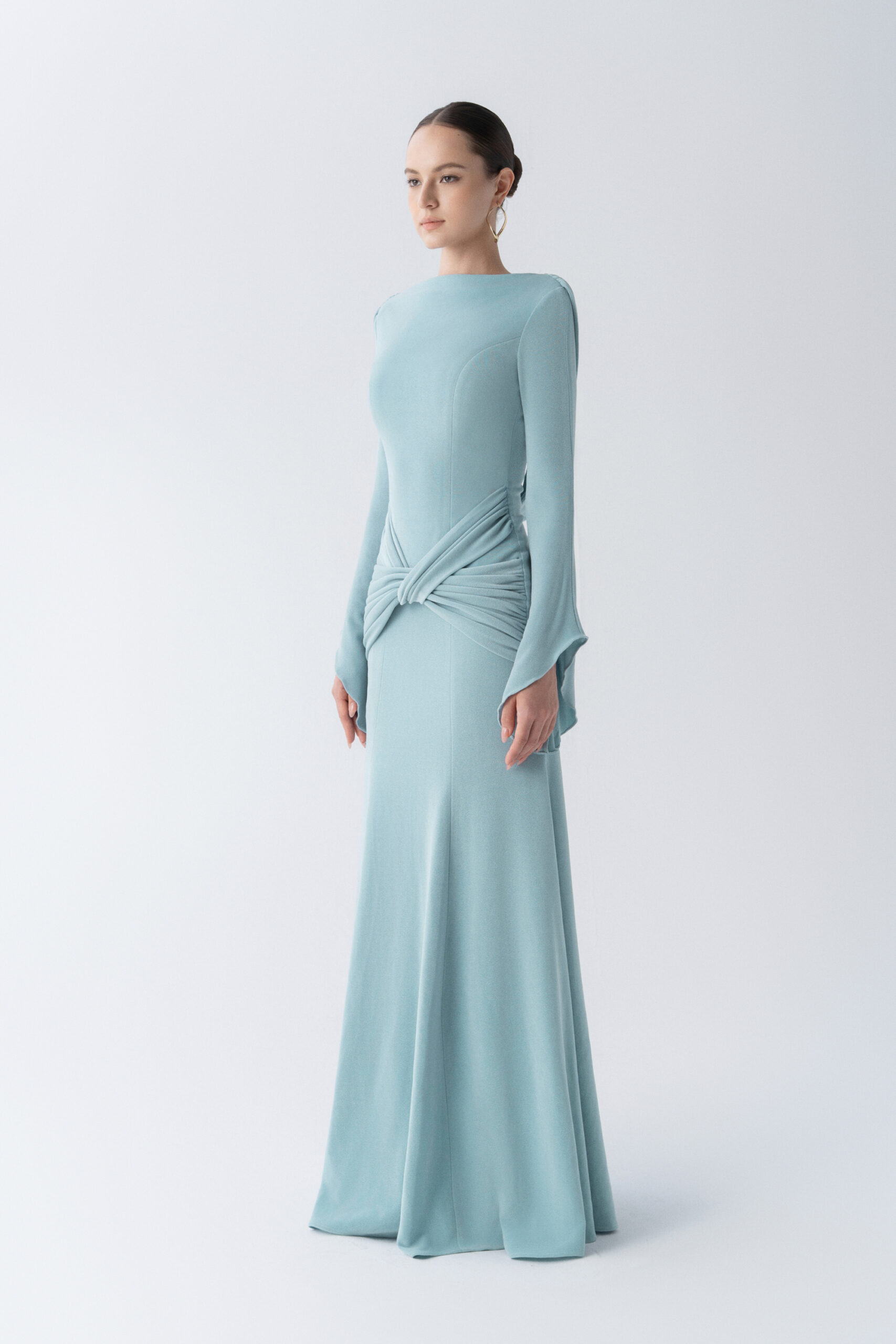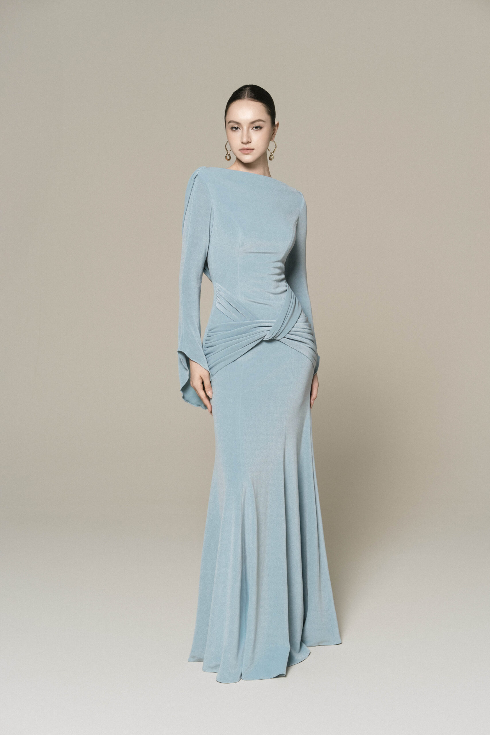 Fishtail gown with central criss-cross draping at the bust, long fitted sleeves that flare subtly at the cuffs.