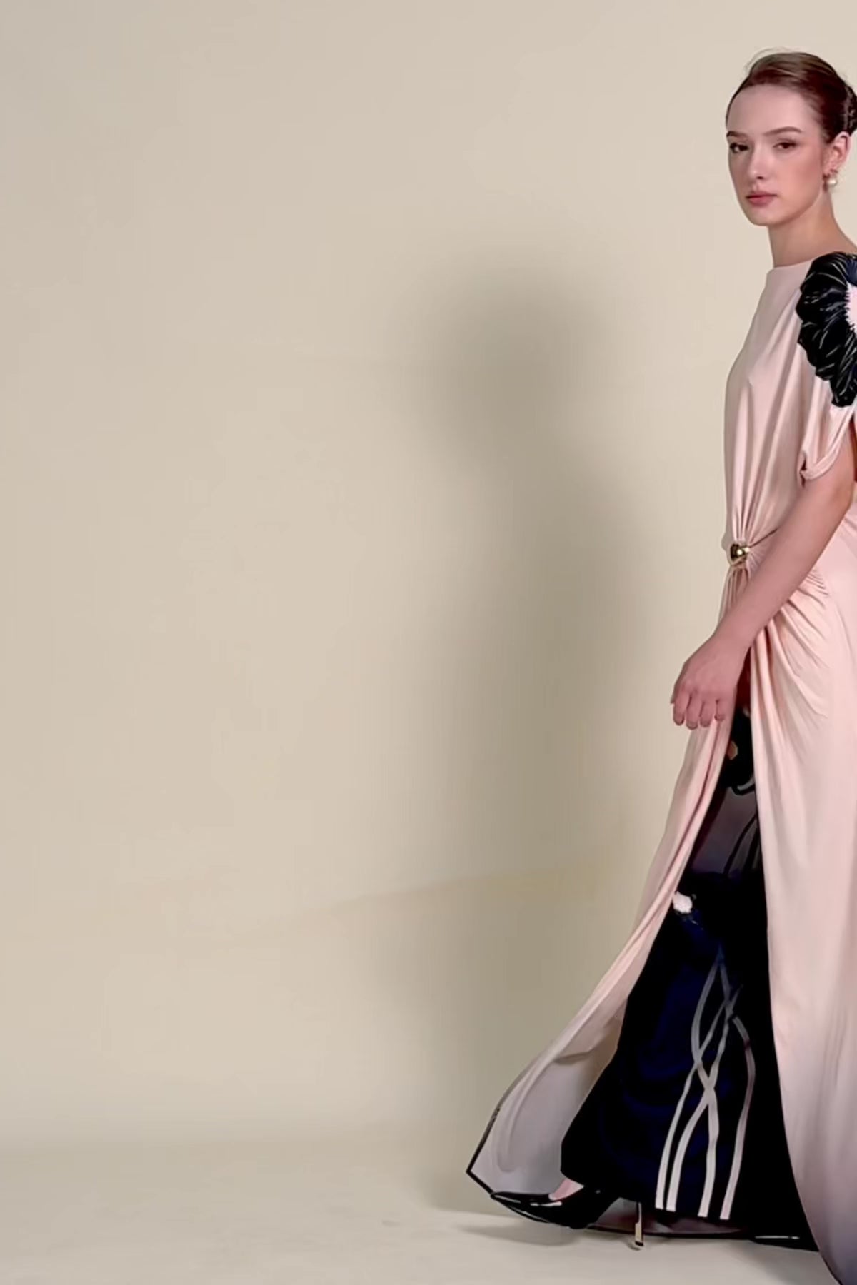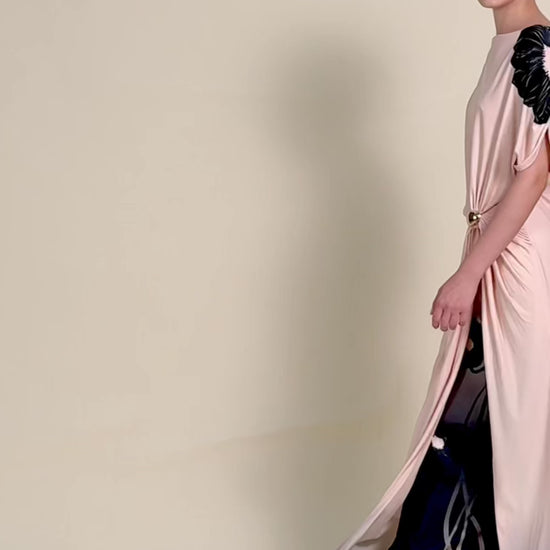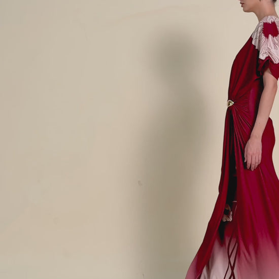 A long ombré dress with short sleeves and relaxed bodice; draping at the waist with a metallic clasp; outer skirt flows softly and inner pencil skirt feature floral branch prints.